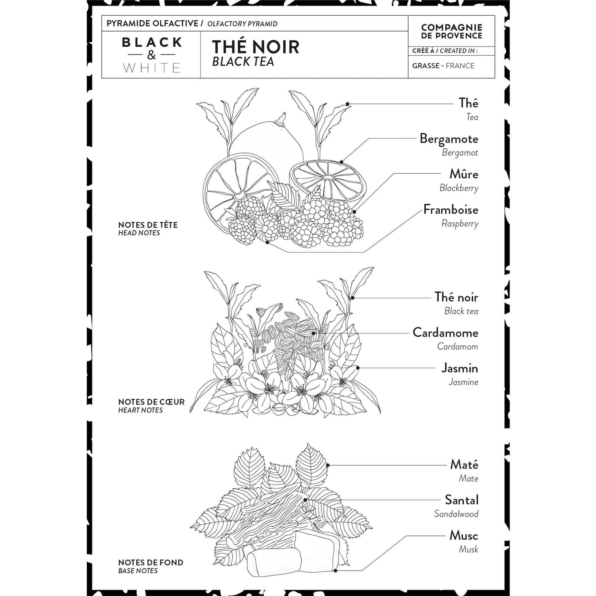 Details: Soap: Made in a cauldron according to tradition, as does its ancestor, the authentic cube from Marseille, this liquid soap is elaborated with vegetable oils. Naturally glycerined, it gently cleanses the skin.Presented in a lacquered glass bottle with a timeless and contemporary design which uses the strength of contrast to create an inspiring graphic universe. Fragrance: A gentle fragrance created in Grasse, with notes of black tea and blackberry. Use Advice: Suitable for frequent skin wash. Can be used for body wash. Apply on damp skin, gently rub and rinse thoroughly. Composition: Natural foaming coconut oil.No colorants, no animal fats. Lotion: "Enriched with shea butter, olive oil and vitamin E, this cream takes care of your hands. Its light and non greasy texture is quickly absorbed and leaves the skin soft, comfortable and gently perfumed.Presented in a lacquered glass pump-bottle with a timeless and contemporary design which uses the strength of contrast to create an inspiring graphic universe. Fragrance: A gentle fragrance created in Grasse, with notes of black tea and blackberry. Use Advice: Apply to hands, at any time, a small amount of cream massaging slightly until completely absorbed. Composition: Shea butter, Olive oil and Vitamin E.