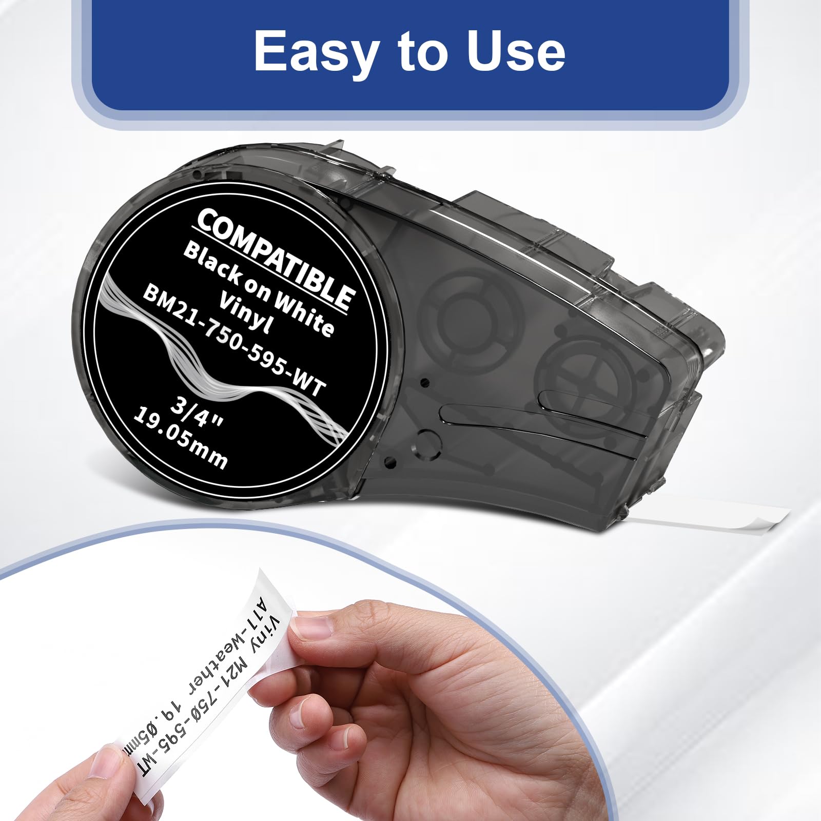 - Package includes: 3 pack compatible M21-750-595-WT 3/4” black on white vinyl label tapes. Width: 19.05mm (0.75 inch), Length: 6.4m (21 feet) for each label tape, Color: Black Print on White tape.
