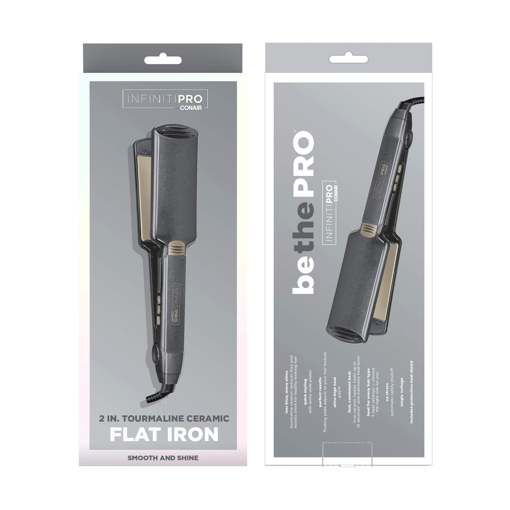 Details: Get shiny straight, frizz-free styles with this salon-quality Infiniti pro 2 in. Tourmaline ceramic flat iron from Conair. Tourmaline ceramic-coated plates prevent static, protect hair from damage and create shiny smooth, straight styles that last all day, even in humidity. Quick heat-up and recovery up to an ultra-high 455 DegreeF, and variable heat settings provide fast, versatile styling options. You can even add a flip with a twist of the wrist.