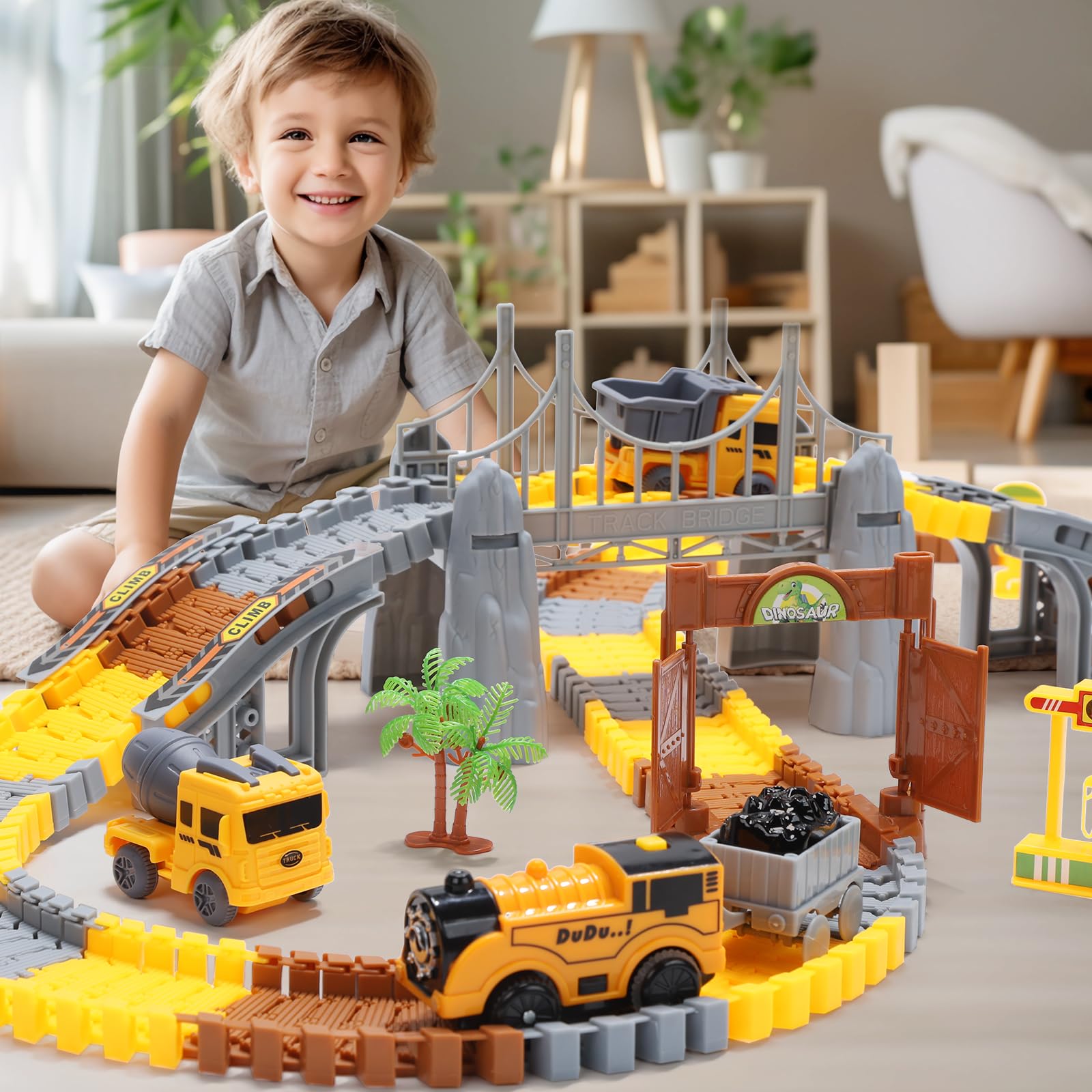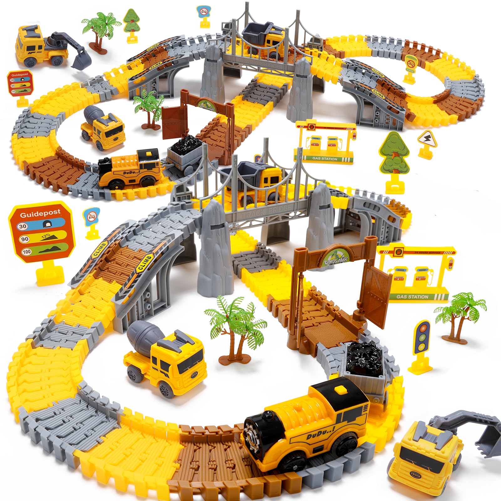 - CONSTRUCTION THEME RACE TRACK SET】-brand new construction race track playset has 178 PCS,track*150, tree*2, bridge*1, electric train*1,3 Different Construction car*1 etc. Imagine that an amazing race track across the construction site. A good interaction toy for toddlers.