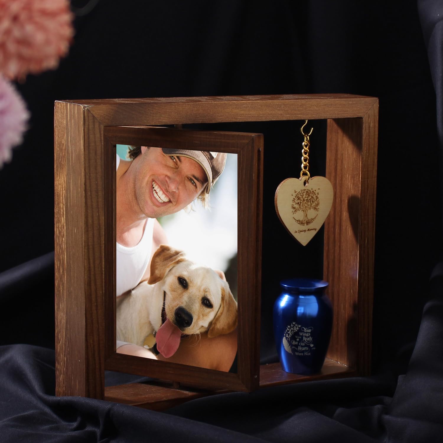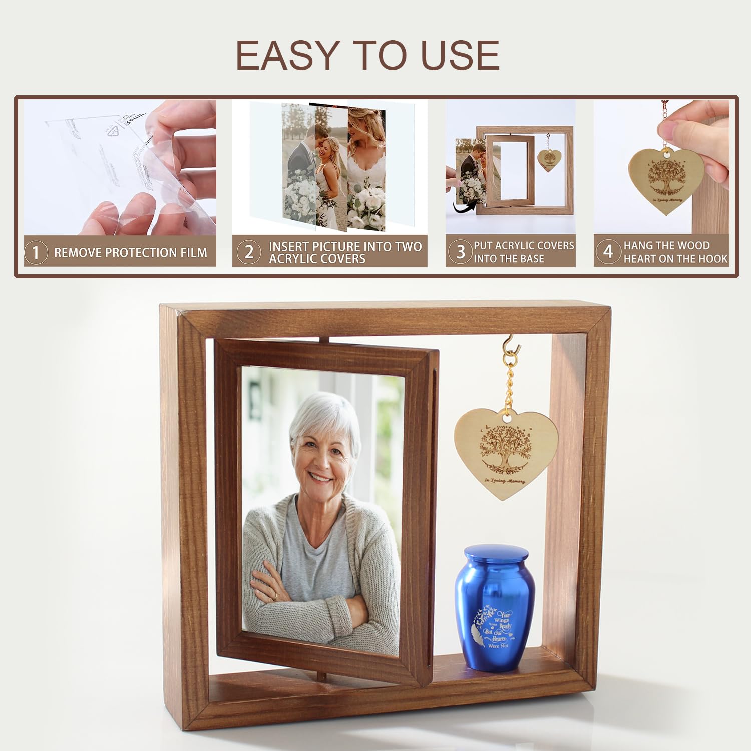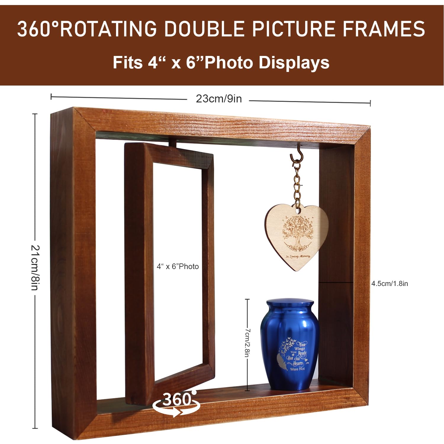 - Memorial Picture Urn:This rotatable keepsake frame is made wood. The overall frame size is 9"L x8"H x 1.8"W and can hold the photo of size 4"-6". The memorial photo frame will preserve the fond memories of your Gifts for Loss of Loved One.