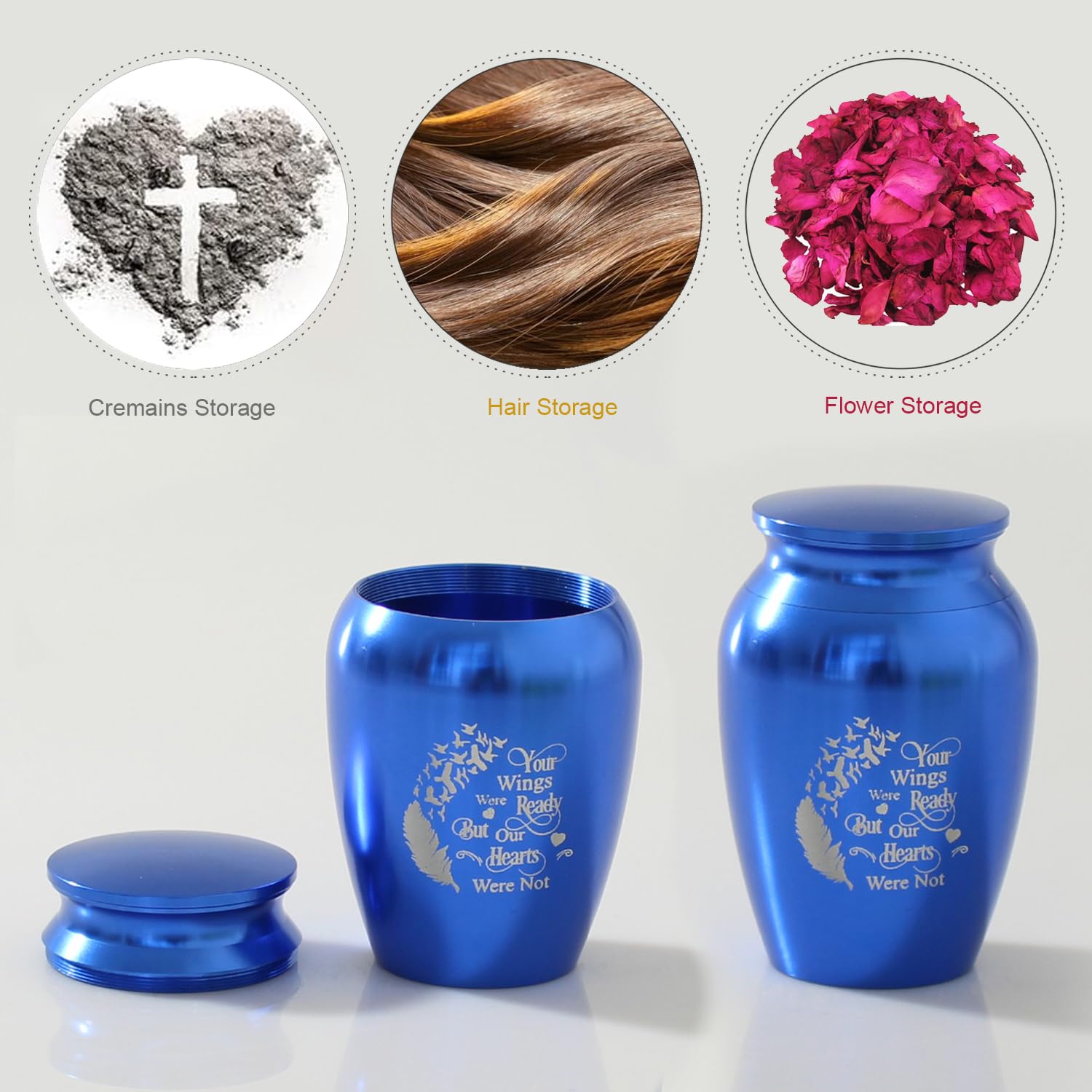 - Keepsake mini Urn:High quality stainless steel has high resistance to rust, corrosion and tarnishing.engraved letters:Your Wings Were Ready But Our Hearts Were Not.Size:1.8" W x 2.8"H.The small urns for ashes keepsake with multiple thread ring are are completely sealed from water or leakage and design to provides a reliable .You can hold a small amount of ash, dried flowers, perfume, essential oils, special information, a strand of hair, clay or sand in the urn to remember you loved one