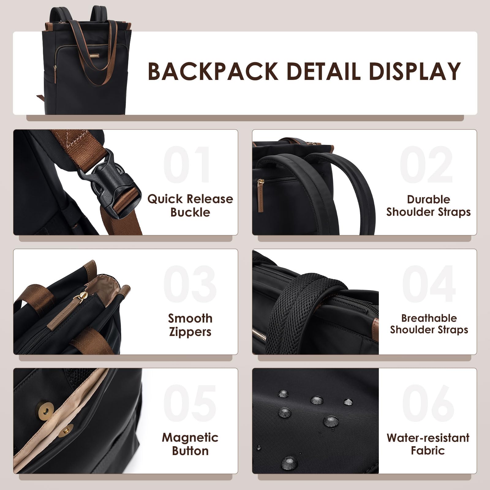 Convertible Laptop Backpack for Women Casual Daypack Notebook Tote Bag for Work College Travel Leisure (Black)