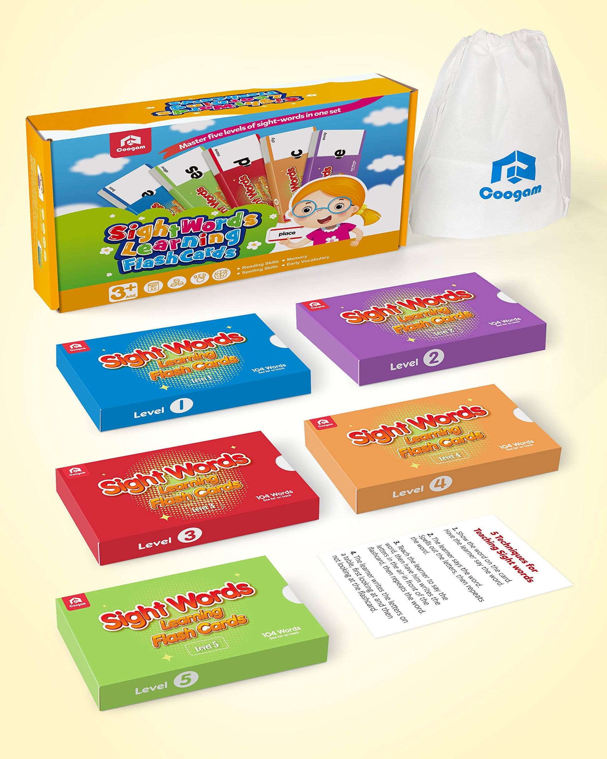 - 260 Pcs Flash Cards: The sight word learning flash card set comes with 260 pcs of double-sided sight words in 5 individual packs, with a piece of guidanceon how to use the cards; and some game suggestions to have fun and learn with kids.
