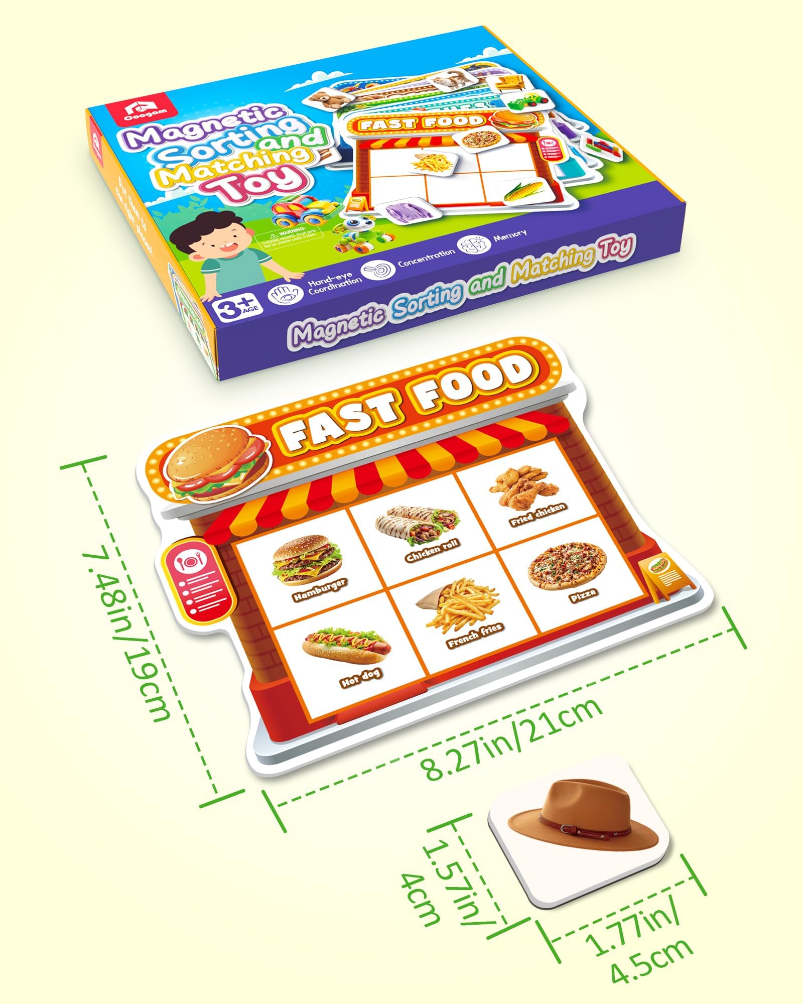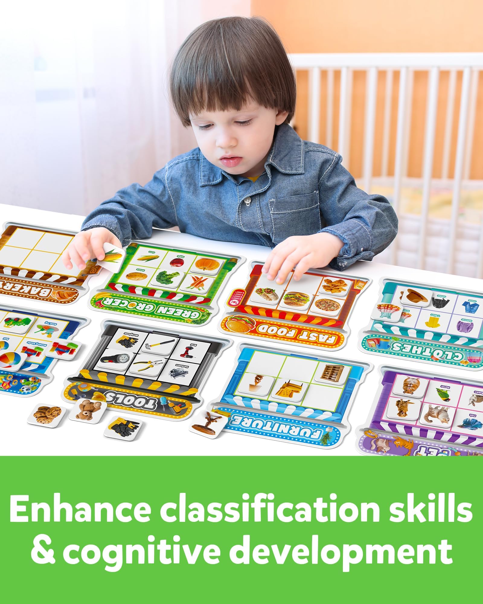 - Multi-theme Magnetic Sorting Toy: This sorting and matching playset has 8 different themes including food, clothes, tools, pets, grocery, furniture, toy, bakery with 8 double sided activity magnetic board. Let kids use their intelligence and wisdom to sort and match magnetic tiles making learning everyday objects enjoyable and interactive