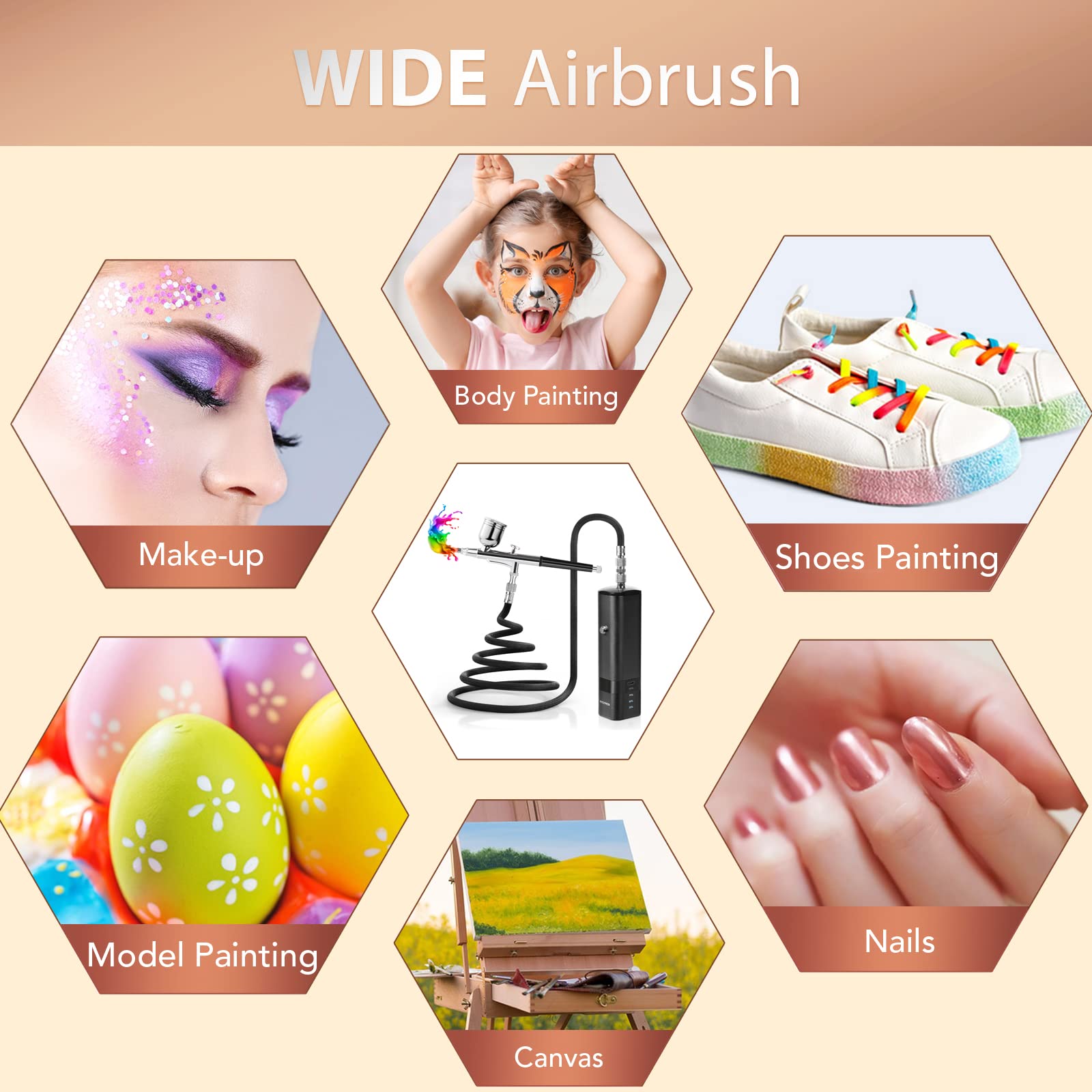 - 32PSI HIGH PRESSURE AIRBRUSH GUN: The pressure of our mini airbrush kit is 30PSI, it is the highest in all handheld airbrush sets in the market, very suitable for airbrush makeup, nail beauty, barber shop. The higher 30PSI is designed for airbrush painting fields: T-shirt painting, cake decorating(decoration), tanning, airbrush model painting, hobby or temporary tattoo.
