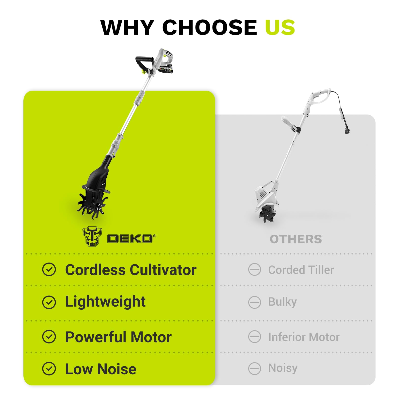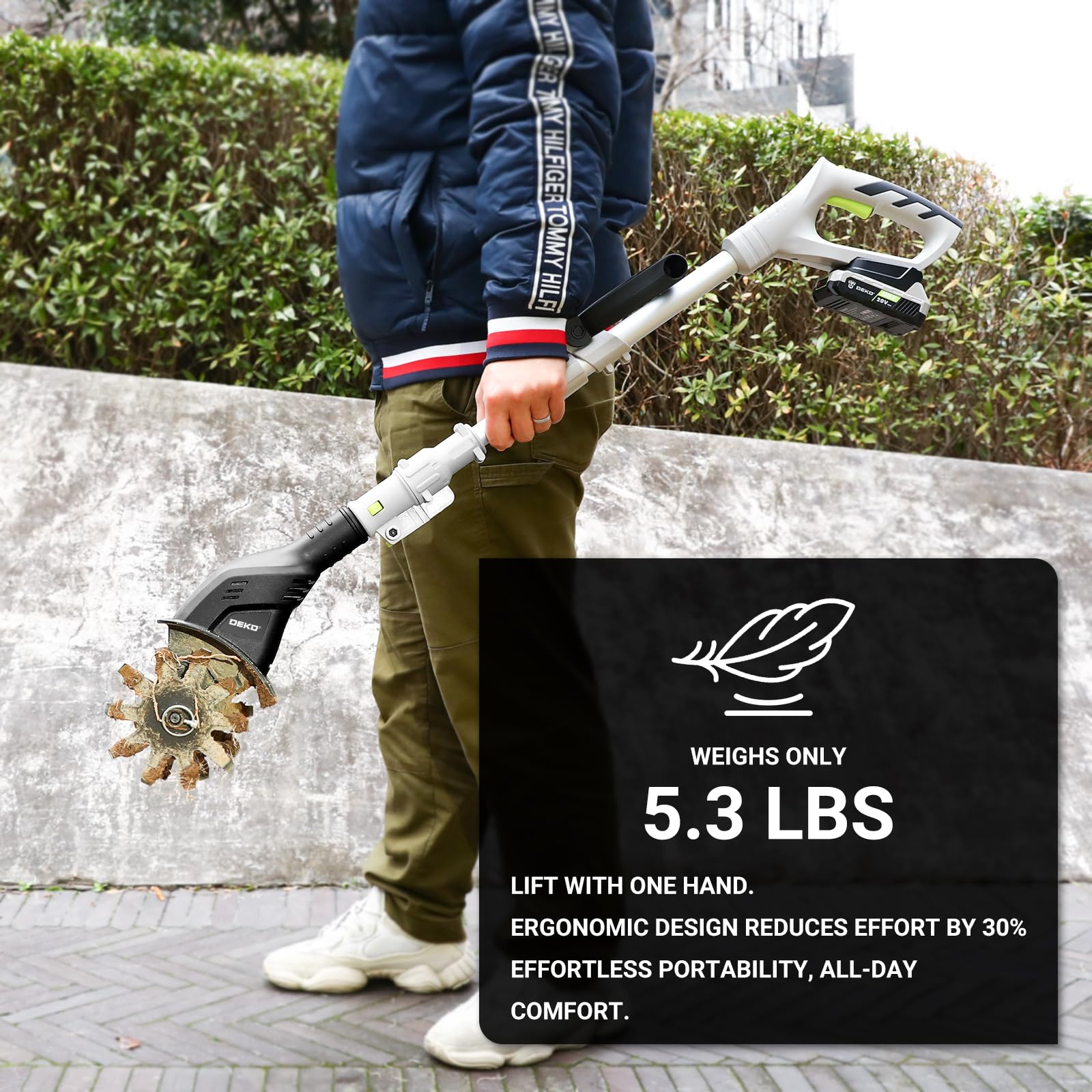 - Cordless Freedom: Say goodbye to tangled cords & gas—the DEKO electric garden tiller delivers true cordless convenience with its 20V 2000mAh Li-ion battery, offering 40 minutes of no load run time! Weighing just 2.7kg, this electric cultivator glides through tight spaces, flower beds, or raised gardens without breaking a sweat. No oil, no noise—just pure, eco-friendly tilling power