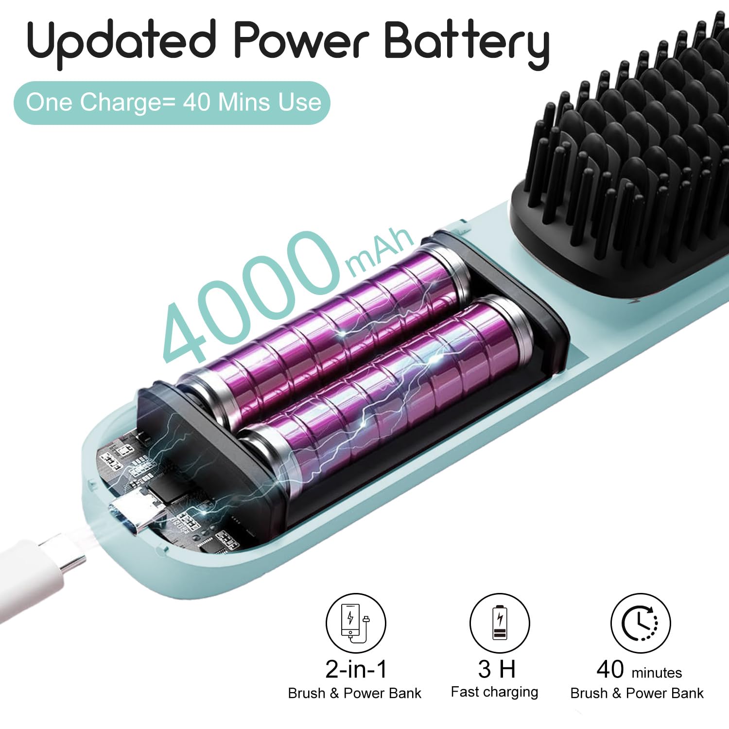 Cordless Hair Straightener Brush 2 in 1-5000W Ionic Ceramic Travel Flat Iron for Quick Styling, Mini Hair Straightener & Curler with LCD Screen, Portable for Women, Salon & Student Use Sea Blue