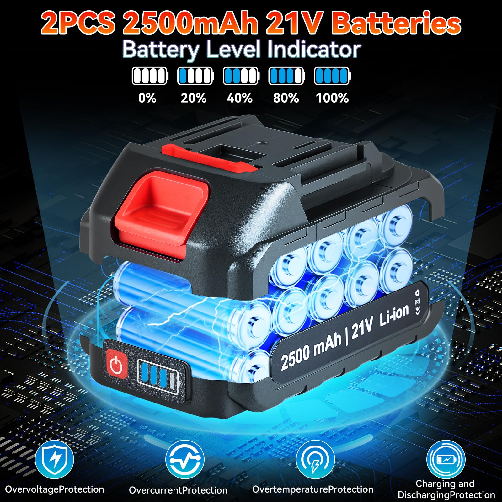 - đă2PCS 2500mAh High-Capacity BatteriesăThis Compressed Air Duster comes with 2 powerful 21V/2500mAh lithium batteries featuring LED power indicators. Enjoy extended 30-minute runtime in turbo mode, with intelligent safety protection including: Auto low-voltage shutdown, Over-current prevention, 2.0A fast-charging system, The removable batteries ensure uninterrupted operation - when one drains, simply swap to the fully-charged backup!