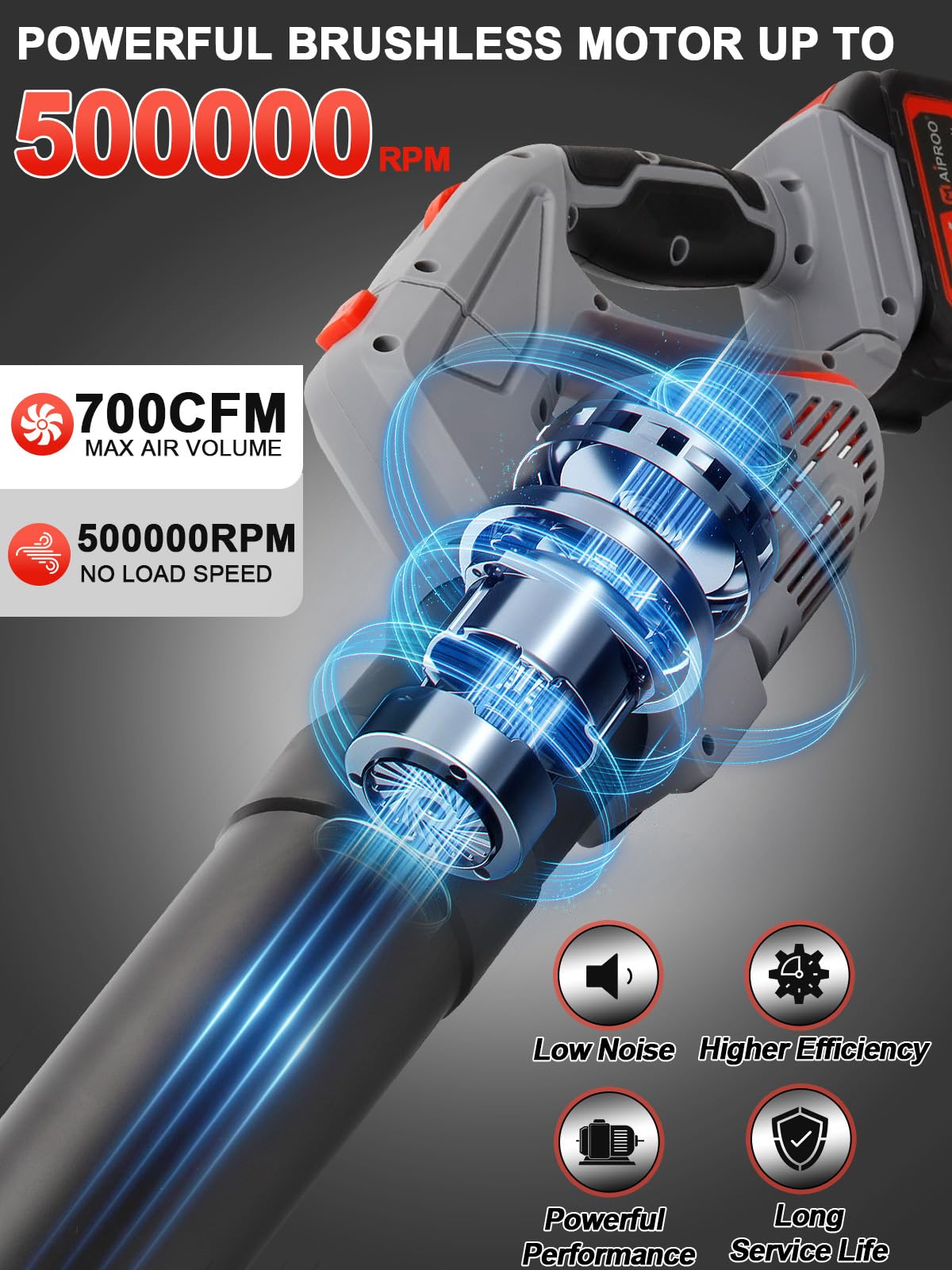 - EFFICIENT AND POWERFUL MOTOR:This leaf blower cordless uses axial fan technology, releasing up to 700 CFM of wind to blow away accumulated fallen leaves instantly. Equipped with an efficient 500000RPM brushless motor, it has long-lasting and powerful power. It also has an ultra-long service life and low noise. Whether it is cleaning up fallen leaves in the yard or blowing dust from gaps, it can be easily done, saving you a lot of time and energy.