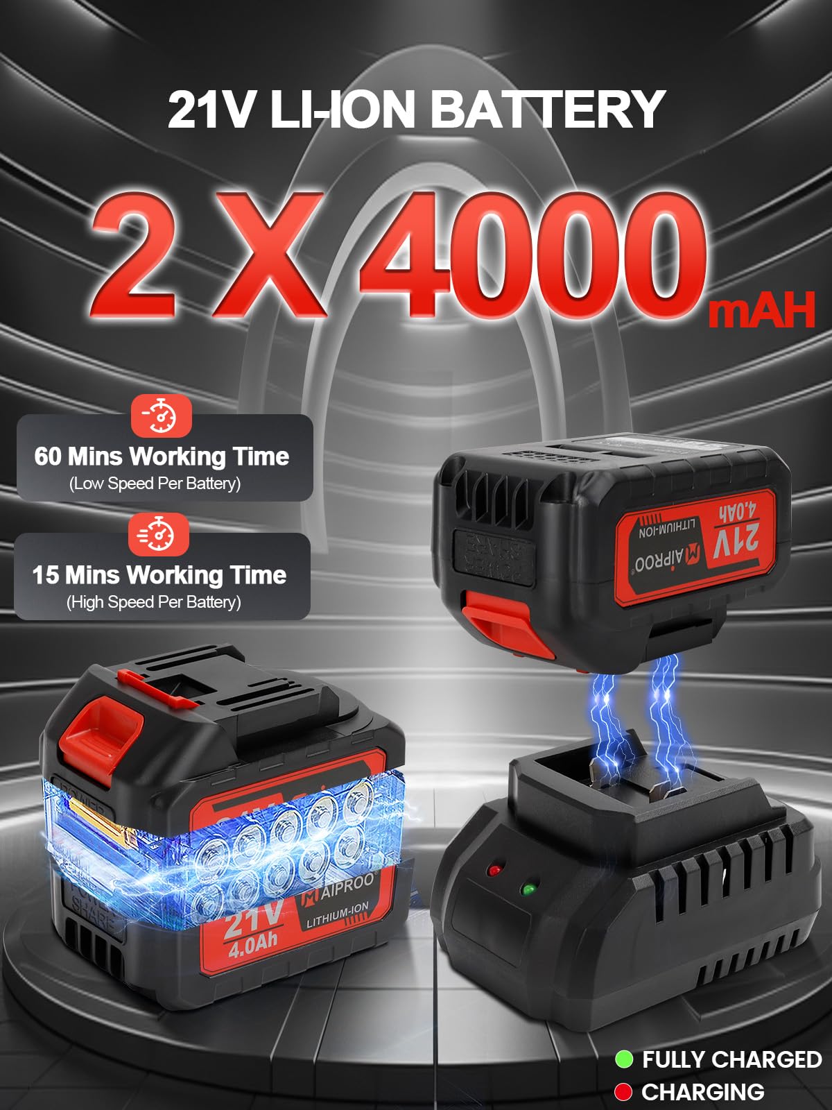 - 21V 2*4.0Ah BATTERY: Our battery leaf blower comes with two powerful 21V 4.0Ah lithium batteries, wireless design, free from the constraints of wires, allowing you to freely shuttle every corner of the yard, from the fence to the big tree, cleaning is convenient! . The cordless leaf blower with battery and charger runs for up to 30 minutes on high speed (15 minutes per battery) and up to 2 hours on low speed (1 hour per battery)