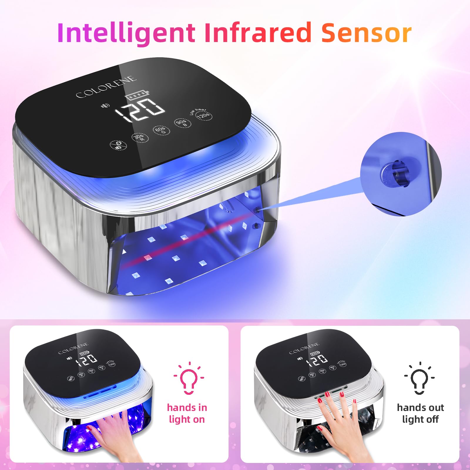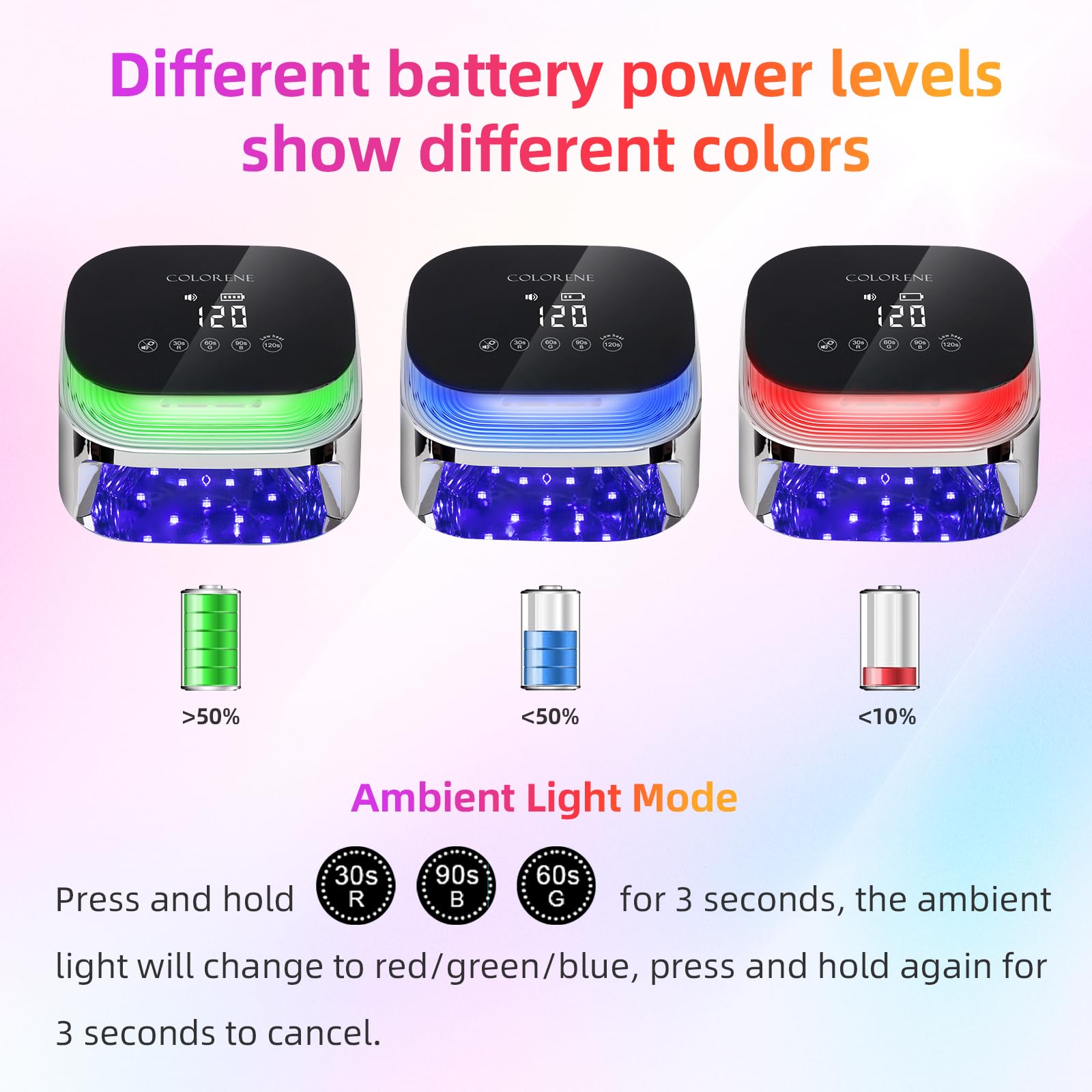- 【Rechargeable & Cordless】COLORENE cordless UV Led nail lamp has a built-in rechargeable battery that can be charged for 3 hours and use for 3-4 hours. You can enjoy it anywhere without being confused by the cord.