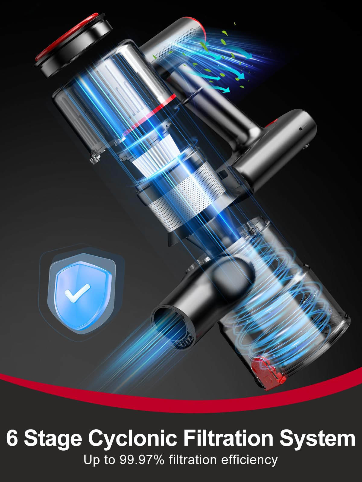 - [6-stage High-efficiency Filtration & 1.5L Large Dust Cup] Unlike most vacuum cleaners on the market, the cordless vacuum adds an additional HEPA filter system at the air outlet, which can remove up to 99.99% of tiny dust particles as small as 0.1 microns. The 6-layer filtration system filters layer by layer, which not only prevents dust from entering the engine and extends the service life of the vacuum cleaner, but more importantly, keeps the indoor air clean.