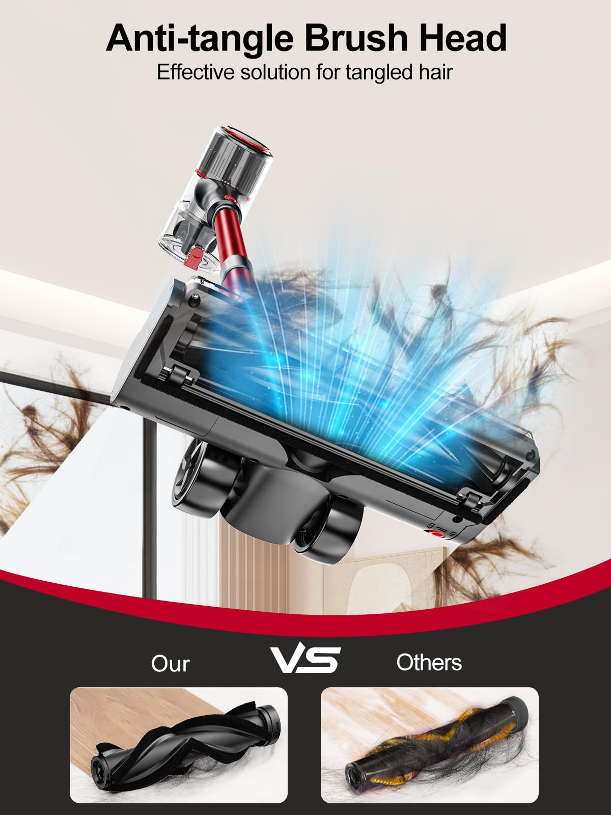 - [Perfect Vacuum Cleaner for Pet Hair] Ideal for those with furry friends at home! The cordless vacuum with a V-shaped anti-tangle floor brush can lift all the embedded dirt and pet hair from carpets or hard floors, effectively reducing hair tangles and spending less time cleaning the drum! The brush head of this highly maneuverable vacuum cleaner can support 270° rotation. 5 bright LED lights provide no place to hide garbage, making cleaning more thorough.