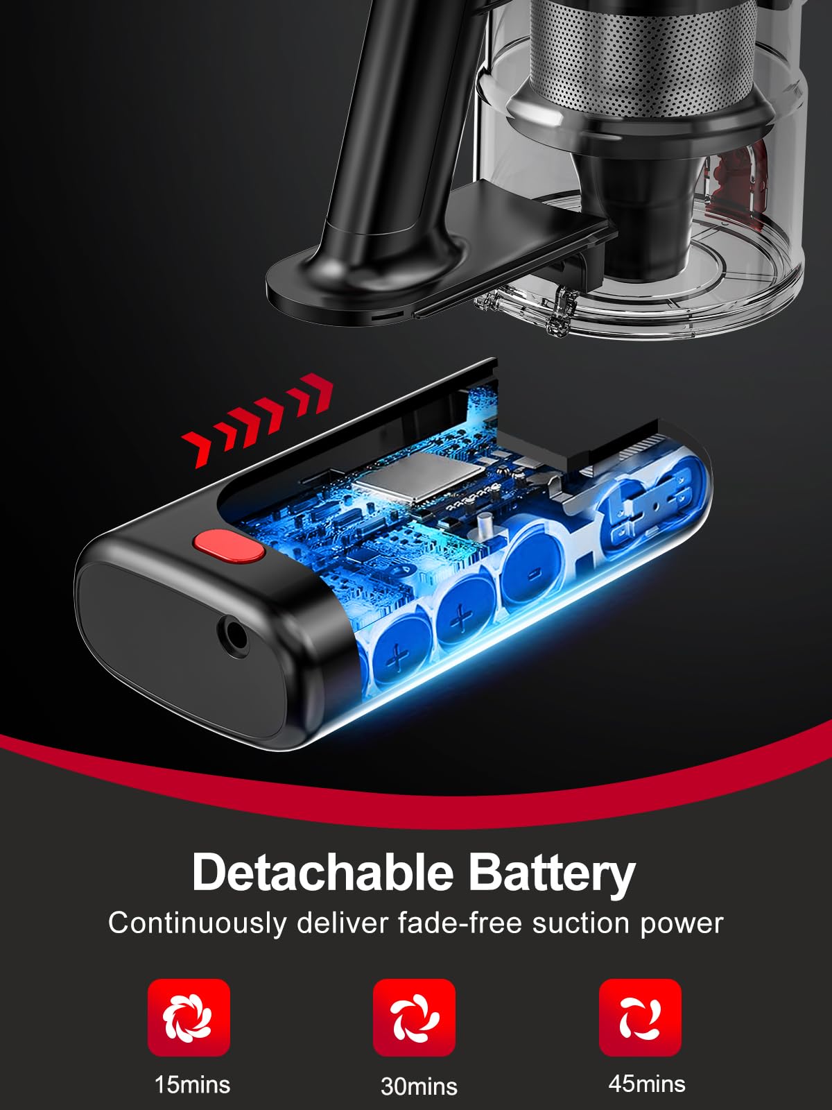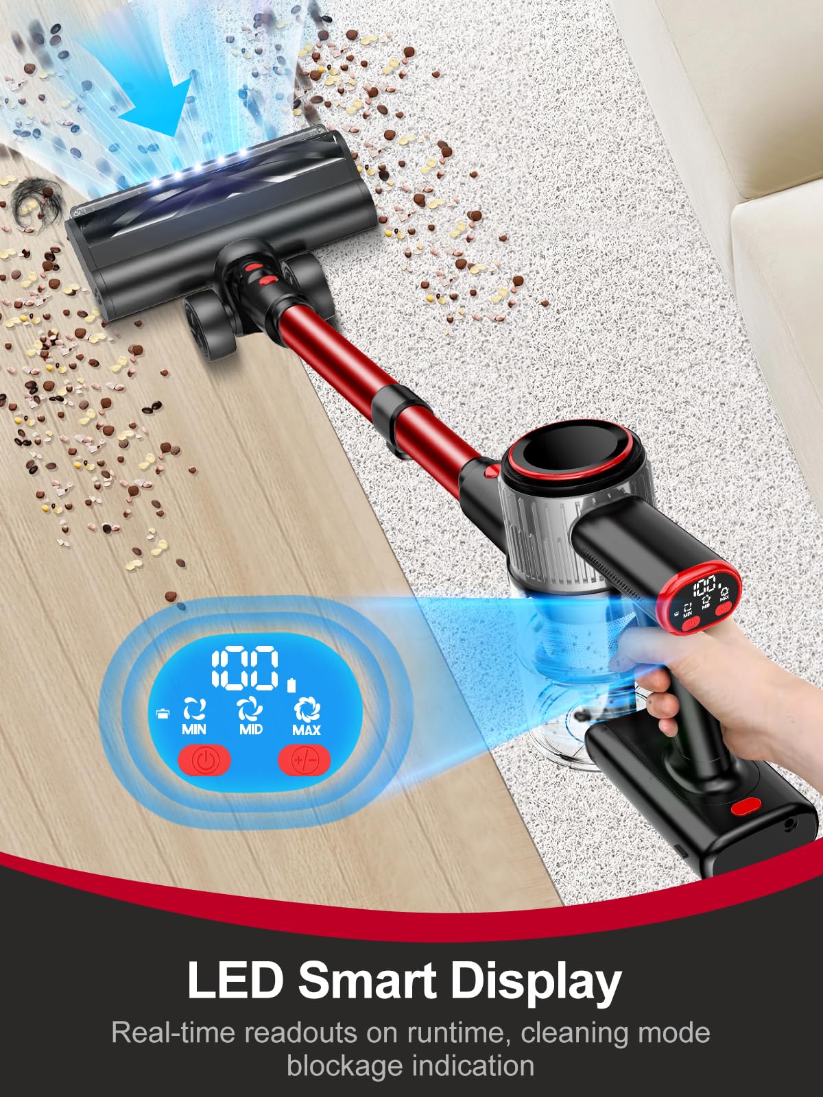 - [Smart LED Display and Blockage Reminder] The LED display shows the remaining power, suction power and blockage reminder of the cordless vacuums in real time. In order to prevent accidental touches, we have designed user-friendly physical button switches and suction power adjustments, making your cleaning work easier and more convenient!
