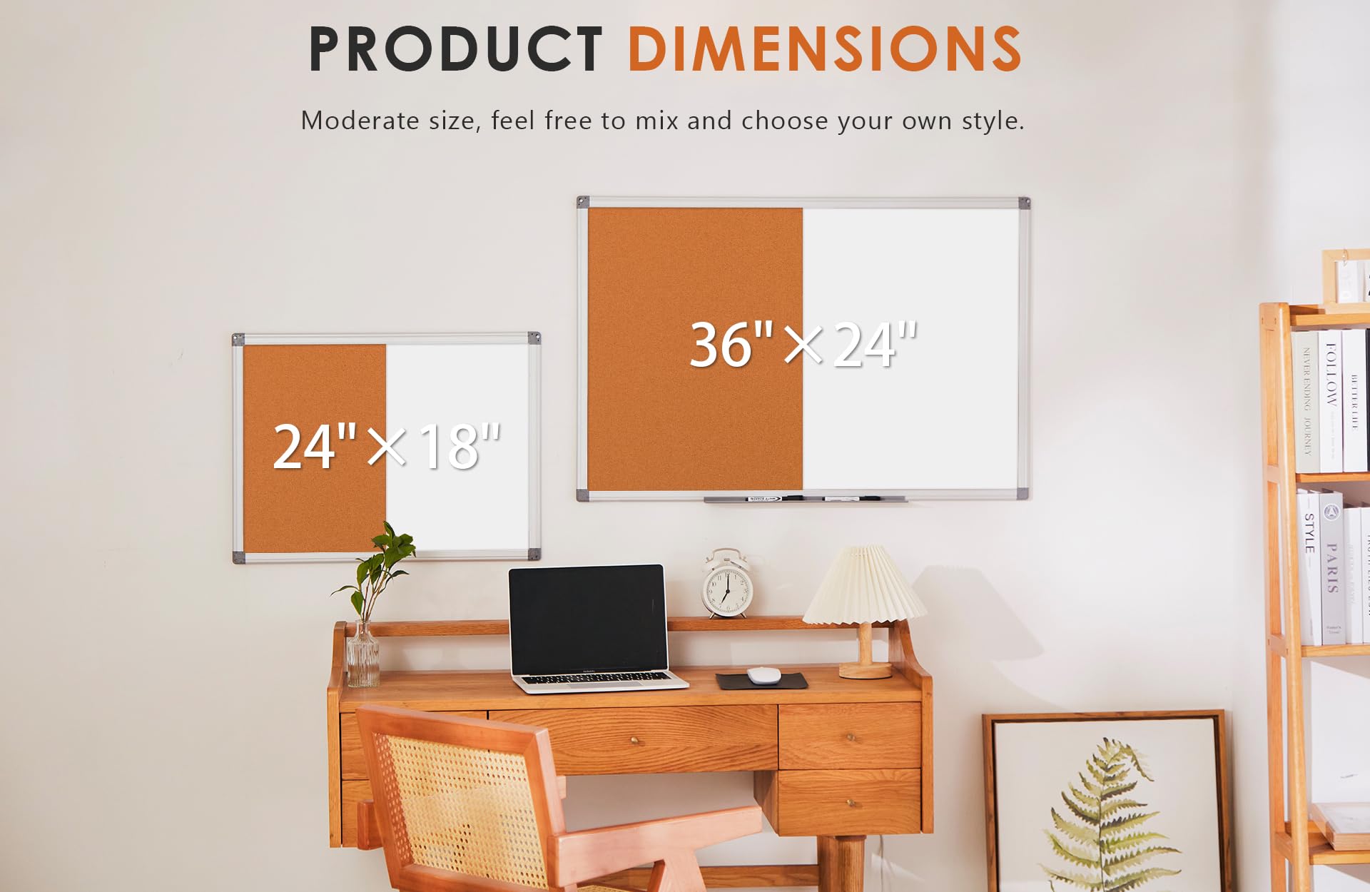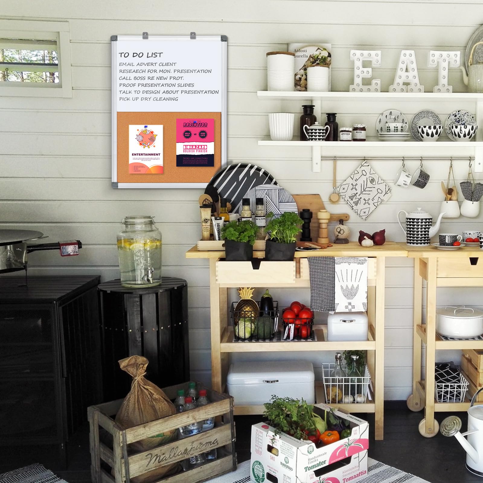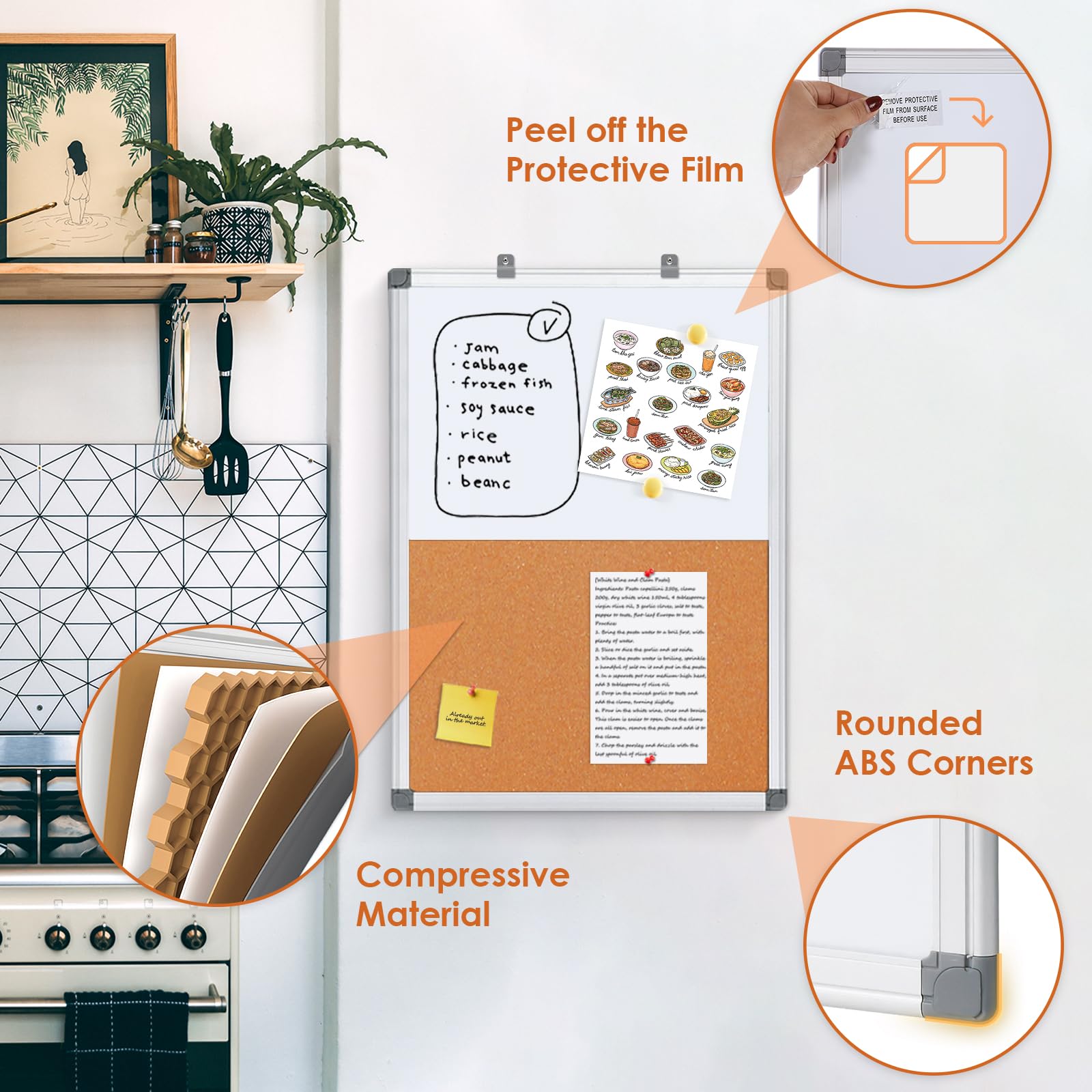 Cork Board and Dry Erase Board Combo Bulletin Board Combination Magnetic WhiteBoard Calendar Pin Notice Board for Home Office School with 4 Dry Erase Maker+6 Magnets+12 Pushpins, 24x18inches