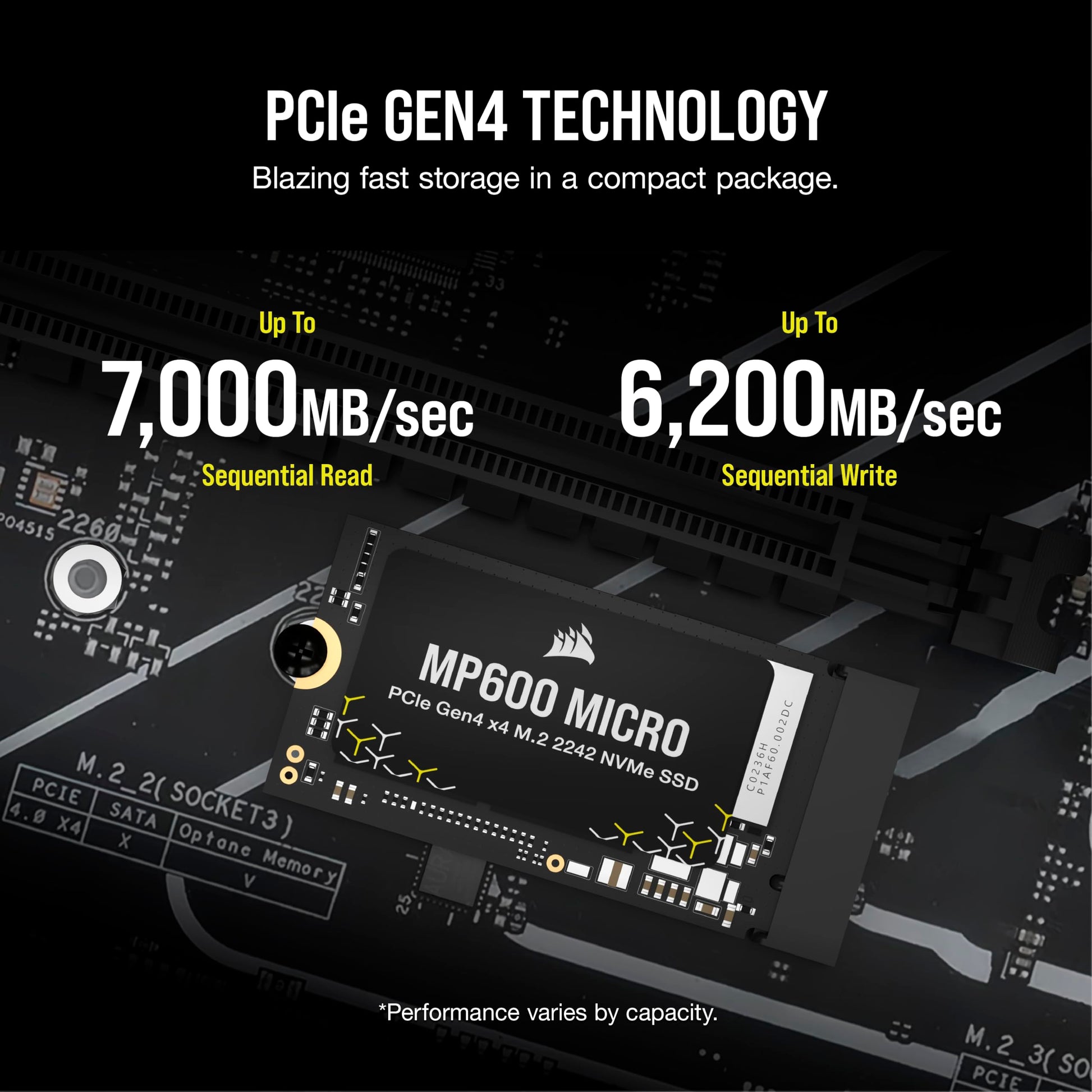 Corsair MP600 Micro 1TB M.2 NVMe PCIe x4 Gen4 SSD – M.2 2242 – Up to 7,000MB/sec Sequential Read – High-Density 3D TLC NAND – Compatible with Lenovo Legion Go and Thin PCIe 4.0 Laptops – Black