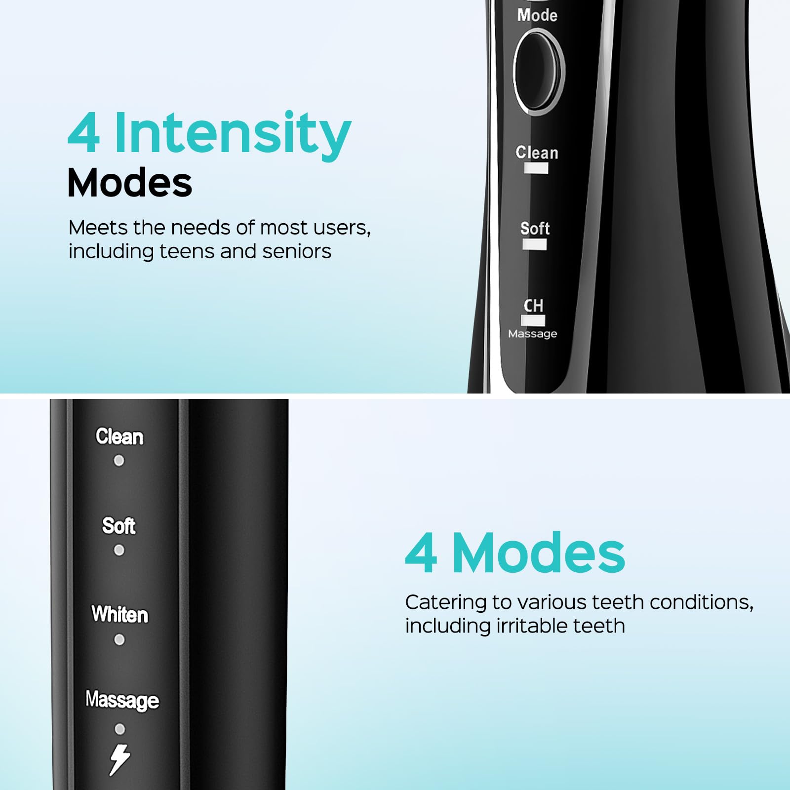 - Suitable for the Whole Family: With 4+4 modes and 4 Tips 4 Brushes meet the teeth cleaning needs of your whole family from the elderly to children. Strong water pressure meets your needs for deep and powerful cleaning, while gentle water pressure provide a comfortable experience.There are four modes: clean, soft, child, and massage,offering a more comfortable and personalized cleaning experience
