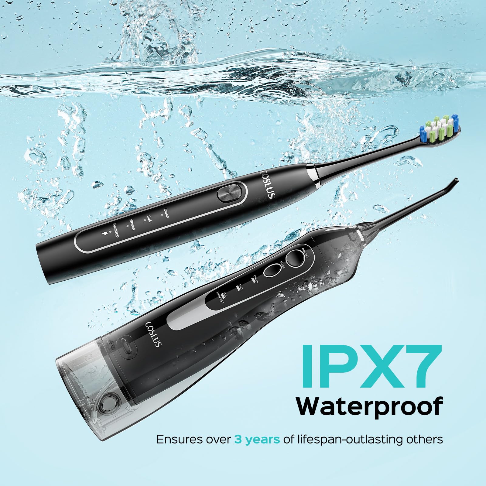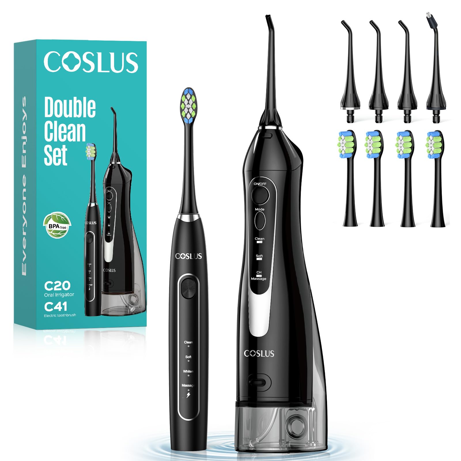 COSLUS Water Teeth Flosser & Electric Toothbrush Combo: 2-in-1 Portable Deep Cleaning Kit, Sonic Toothbrush and Pick with Multiple Modes & 4 Tips 4 Brushes for Family, IPX7 Waterproof, Black, C20&C41