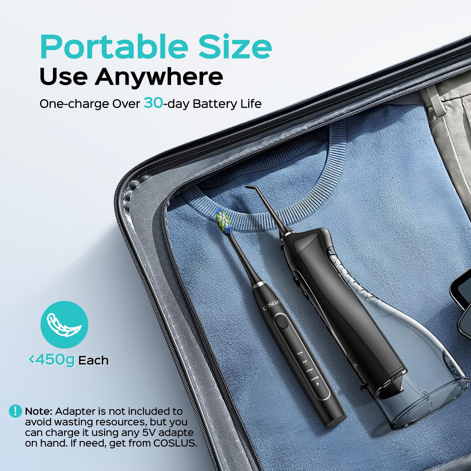 - Portable & Long-Lasting Battery for Travel:The 2-in-1 travel electric toothbrush with water clean flosser is designed with portability, weighing less than 450g and easily fitting into your luggage or backpack for effortless travel. The water line flosser lasts up to 30 days on a single charge, while the electric toothbrush is 45-day, eliminating the need for frequent recharging during long trips. With USB fast charging, you can keep your breath fresh and your smile confident, even on the go