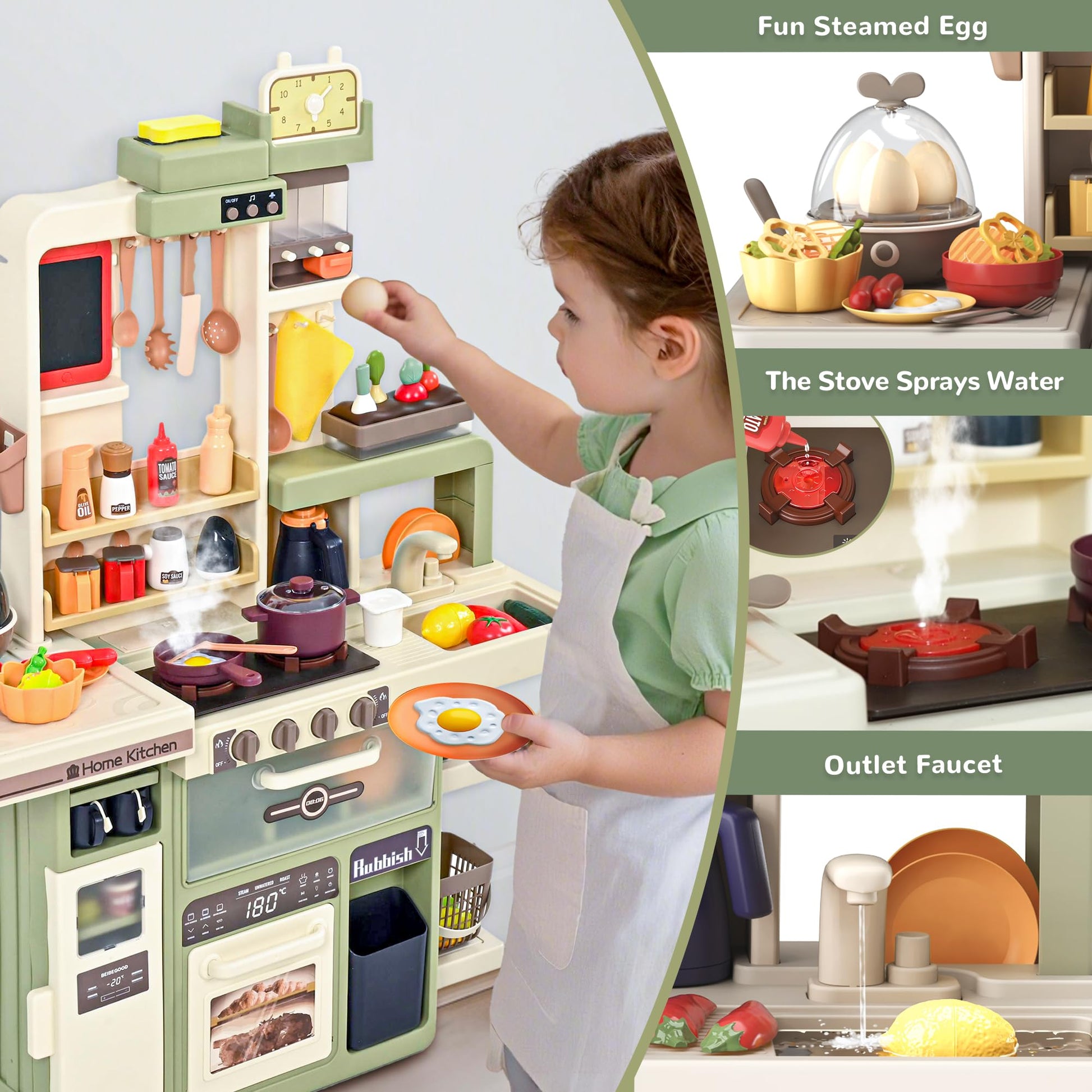 - Realistic Cooking Experience:The Electronic Stovetop In This Toy Kitchen Set Features A Steam Effect. Simply Drip Water Into The Small Hole On The Stovetop, And You'll See Real Steam Spraying Out.This Kitchen Set, Designed Specifically for Toddlers Aged 3 - 5, Is Equipped with a Water Circulation Function. Kids Can Wash Dishes in the Sink, Enabling Them to Have a Realistic Cleaning Play Experience and Develop Their Hands-On Skills Through This Children's Kitchen Set