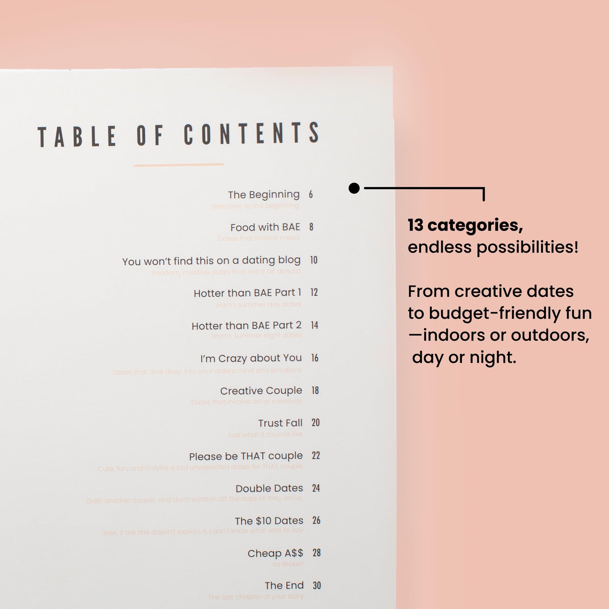 - FOR COUPLES OF ALL AGES: Whether you've just started dating or are celebrating your 50th anniversary, this date book for couples is perfect for spicing things up. We would rate it PG, but feel free to adjust!