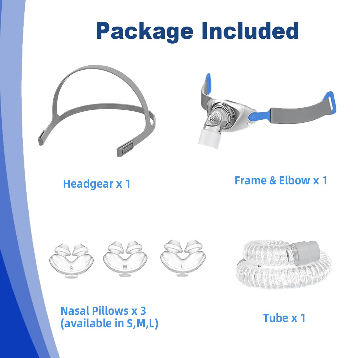 - Package includes:S,M,L Nose Pillows,Headgear,Frame,Elbow,Swivel and Hose.