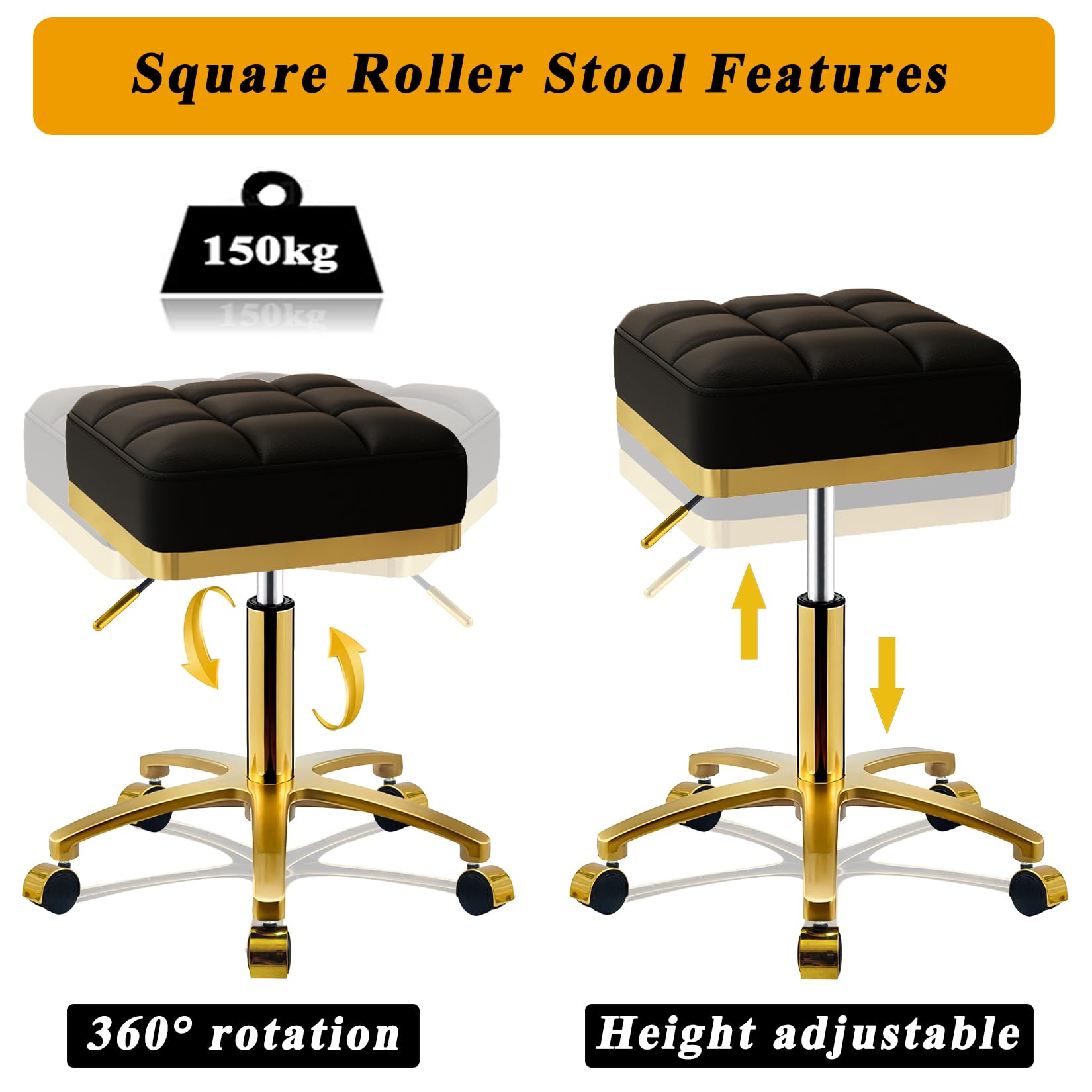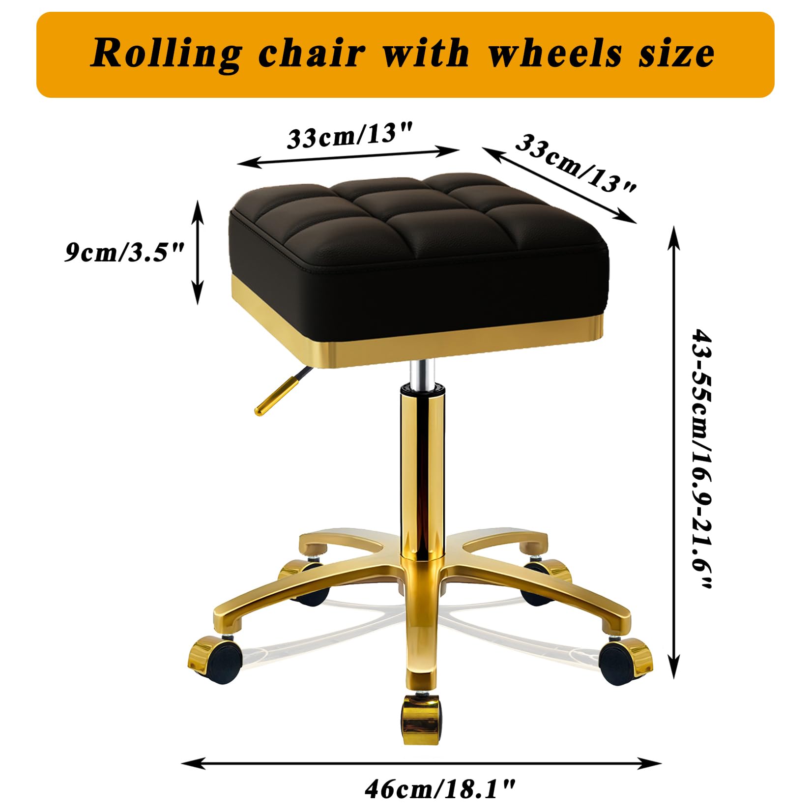 CQAEBK Square Rolling Stool Gold Adjustable Swivel Stools with Wheels, Vanity Lash Nail Salon Spa Roller Chair, Esthetician Massage Office Pedicure Stool, Heavy Duty Gold Plated Frame (Black)