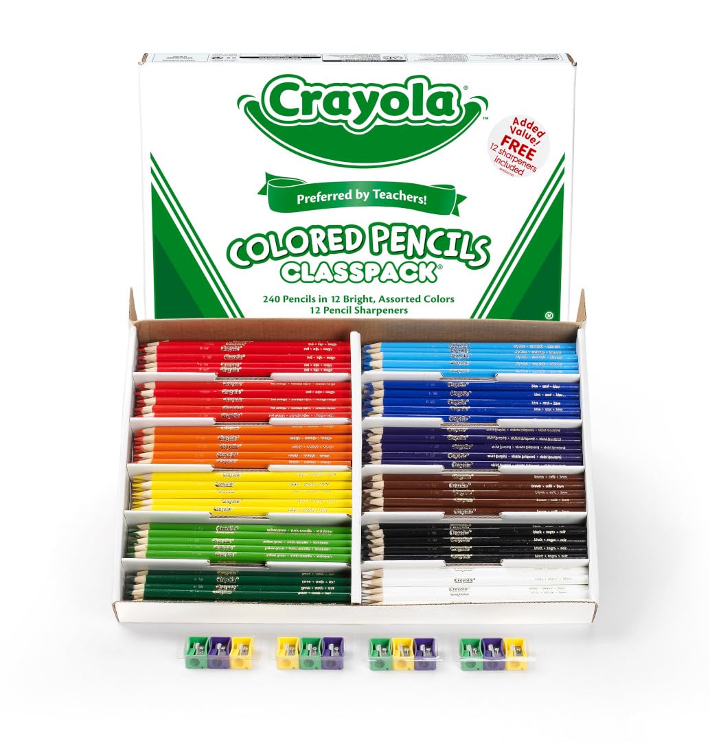 - CLASSROOM SET: This Crayola Classpack features 240 coloured pencils in 12 assorted colours with 12 sharpeners in 3 colours.