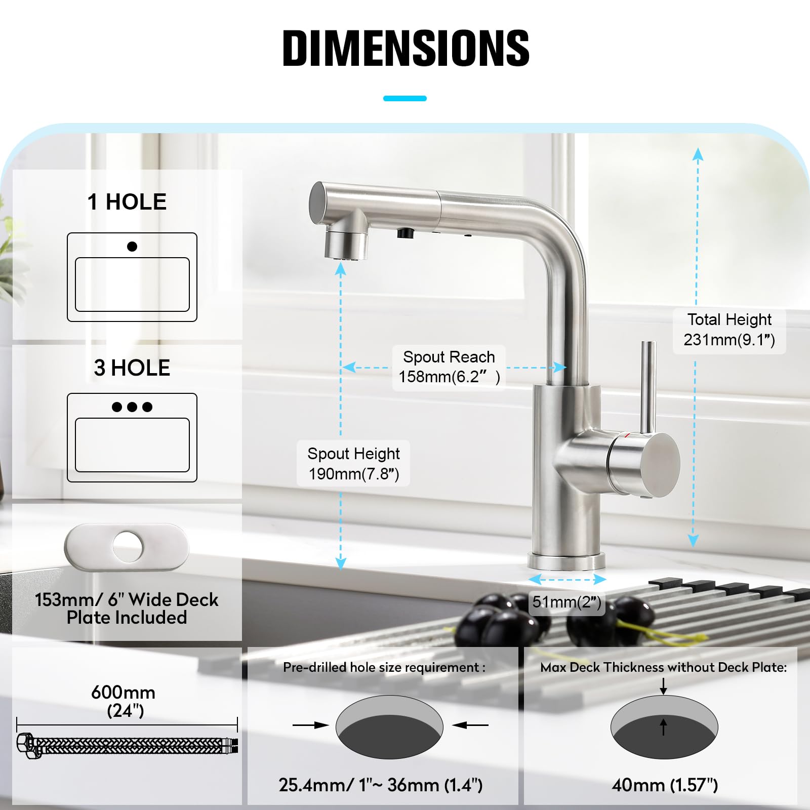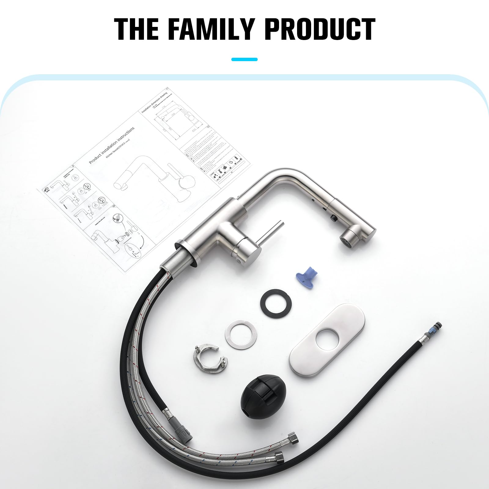 - 【Pull Out Spray Head】This pull down bar faucet with counterweight to lock firmly in place, and the sprayer head will automatically retract after each use.The 24" (60 cm) flexible hoses are already installed on the prep sink faucet, convenient and safe.