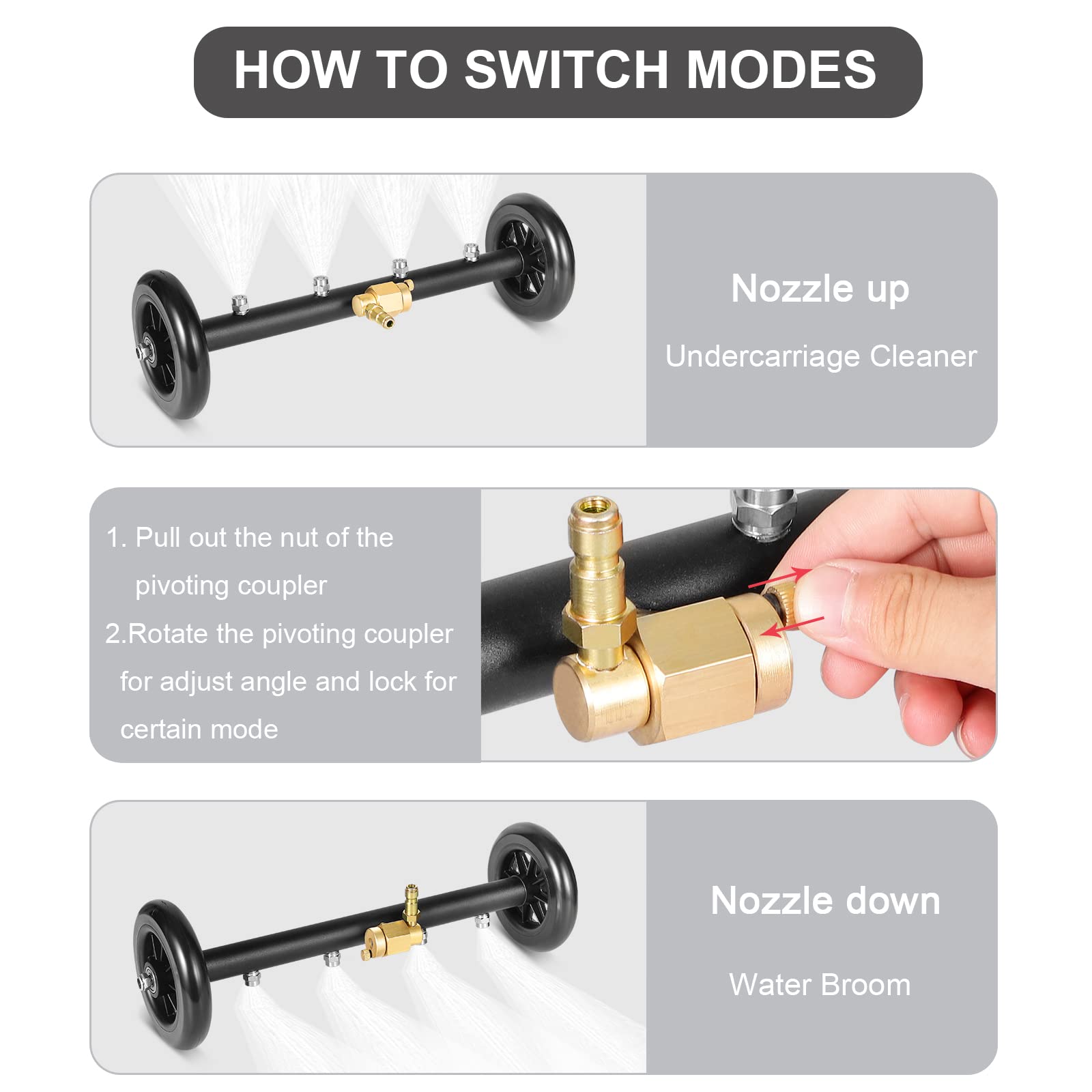 - Dual Mode Pressure Washer Attachment - designed as undercarriage cleaner and water broom. Easily change the cleaning mode with the pivoting coupler by adjusting nozzles up and down. Enjoy your cleaning work in a easy and quick way, saving more time and effort. It's for pressure washer use and won't fit garden hose or water faucet .