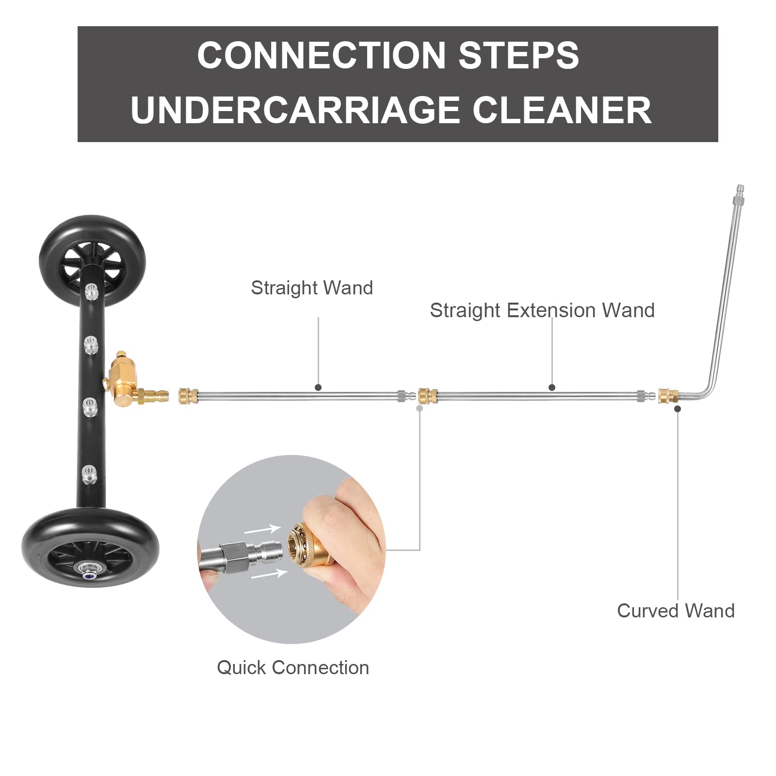- Undercarriage Cleaner Mode: Easy to clean and avoid crawling under the vehicle. Undercarriage washer is to clean road dirt, oil and fuel contamination under trucks, SUVs, cars, commercial vehicles and trailers. It works as under carriage power washer.