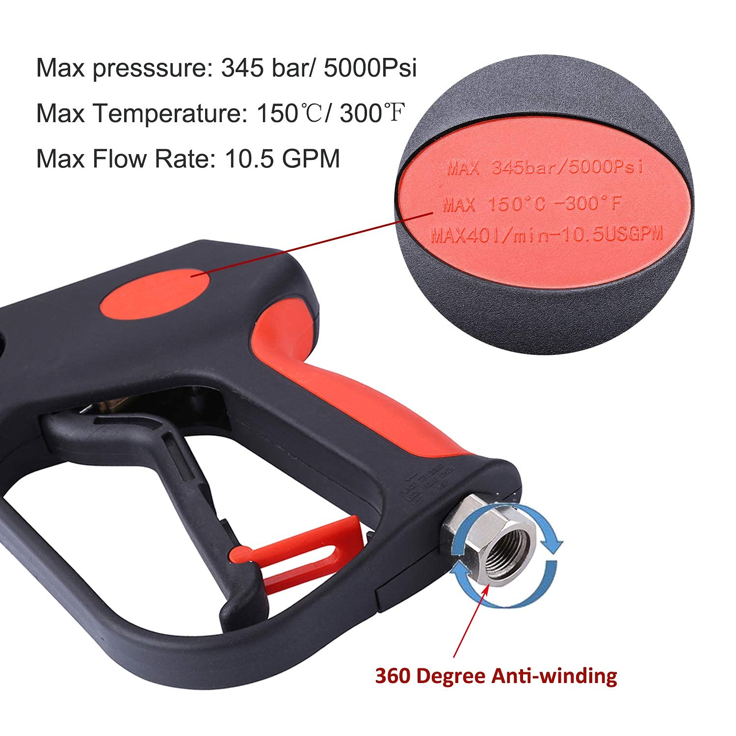 - ✔Ergonomic and Soft Pull desgin, reducing your hand fatigue operation. The gun features a locking safety handle to prevent accidental sprays. 5 pressure washer spray tips Included.