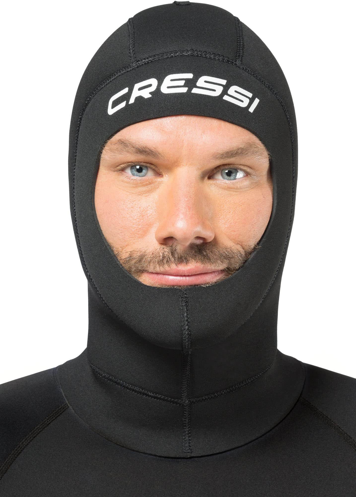 - The thickness is 7 mm on the cranium and 5 mm skin-in neoprene for the face and neck. Face area left unbound to allow for custom trimming.