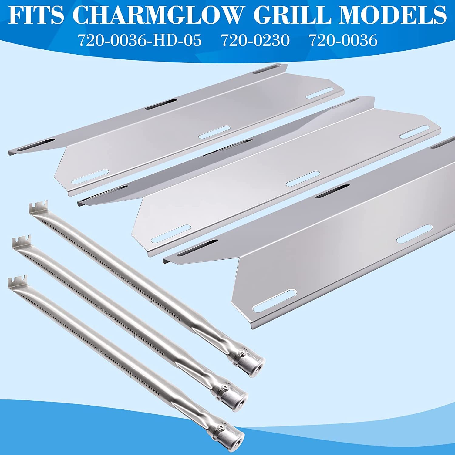 Details: Renew your charmglow 720-0036-hd-05 720-0230 gas grill with these grill replacement parts. Freshen the looks and performance of your grill parts, to enhance the life span of your charmglow grill. Package consists of 3pcs stainless steel grill burners, 3pcs stainless steel heat shields.