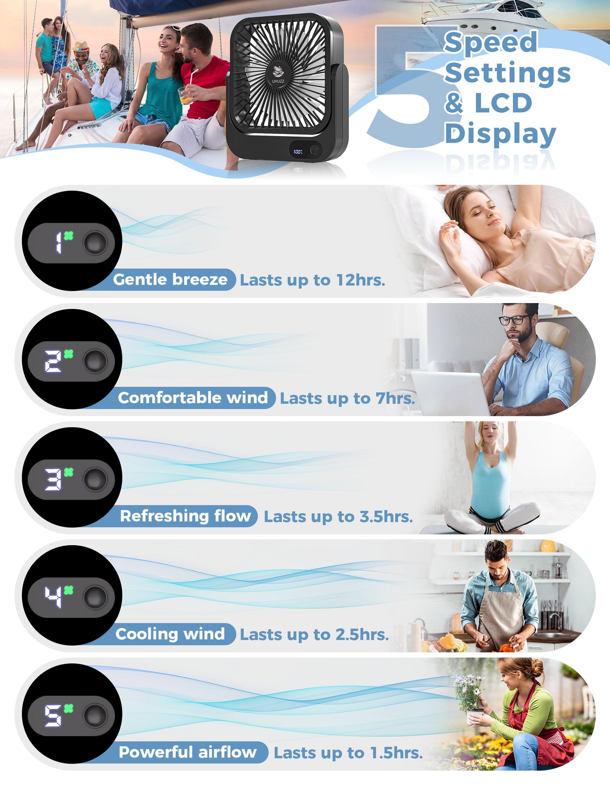 - Rechargeable & Plug-in – 4000mAh Battery Ideal for Cruise Packing List, whether you’re charging it via USB or plugging it in for continuous use, this fan offers the flexibility you need. No more worrying about battery life – enjoy cool air for up to 12 hours on the lowest speed setting, perfect for those long days at sea.