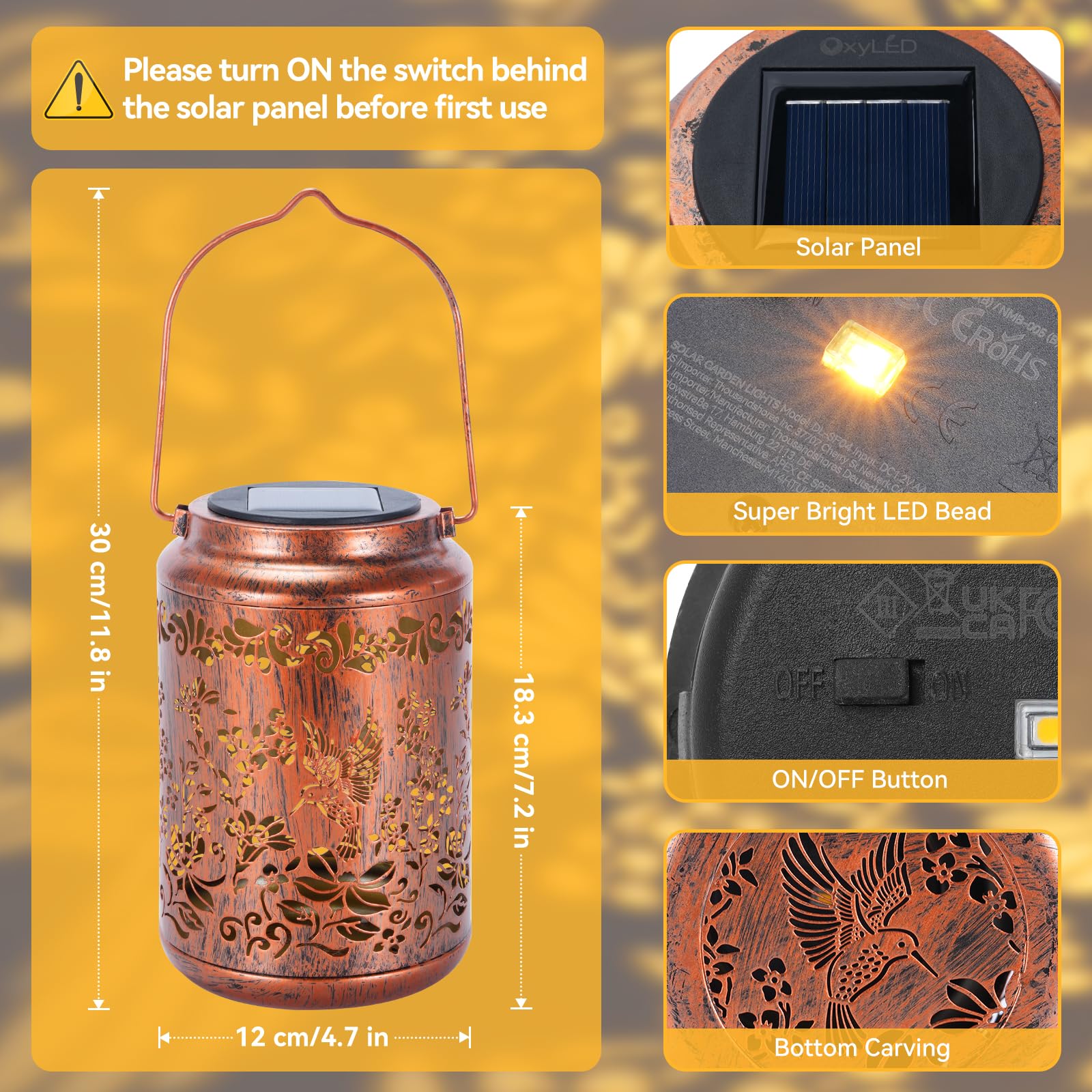 - DECORATIVE & FUNCTIONAL LANTERNS: Why give up beauty for practicality? The OxyLED hummingbird Solar Light is retro, elegant and effective. The solar light provides some much-needed illumination, casting gorgeous, whimsical pattern of hummingbird. It is a great decorative touch for gardens, backyards, driveways, pathways, camping, Halloween, Christmas etc.