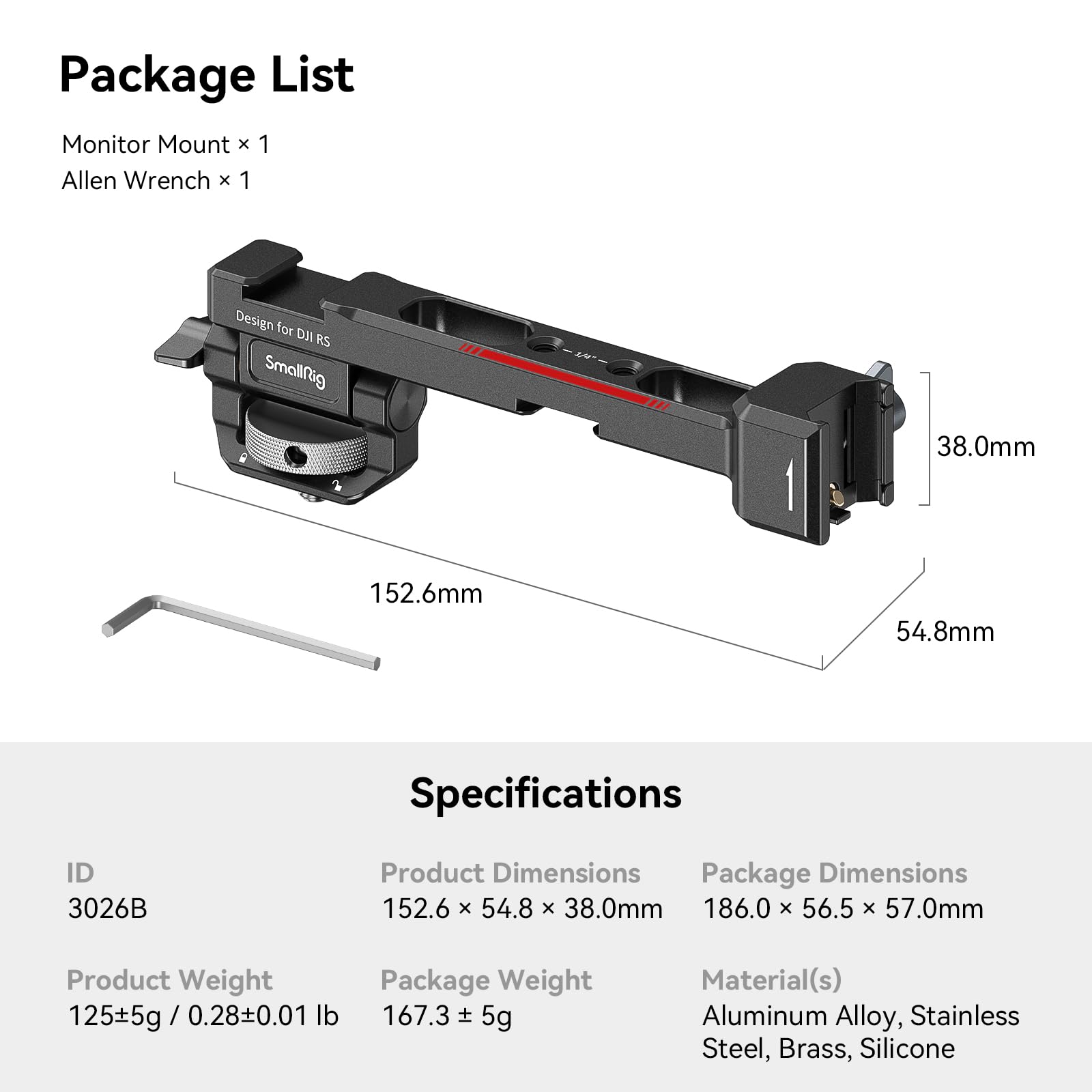 - 【FOR DJI RS 4 Mini / RS 2 / RSC 2 / RS 3 / RS 3 Pro/ RS 3 mini / RS 4/ RS 4 Pro】SmallRig Monitor Mount 3026B is specially designed for DJI RS 2 / RSC 2 / RS 3 / RS 3 Pro/ RS 3 mini / RS 4/ RS 4 Pro gimbal. This mount is designed for adding accessories on both sides of the stabilizer, such as a camera monitor, LED light, sound receiver, wireless device, action camera, etc.