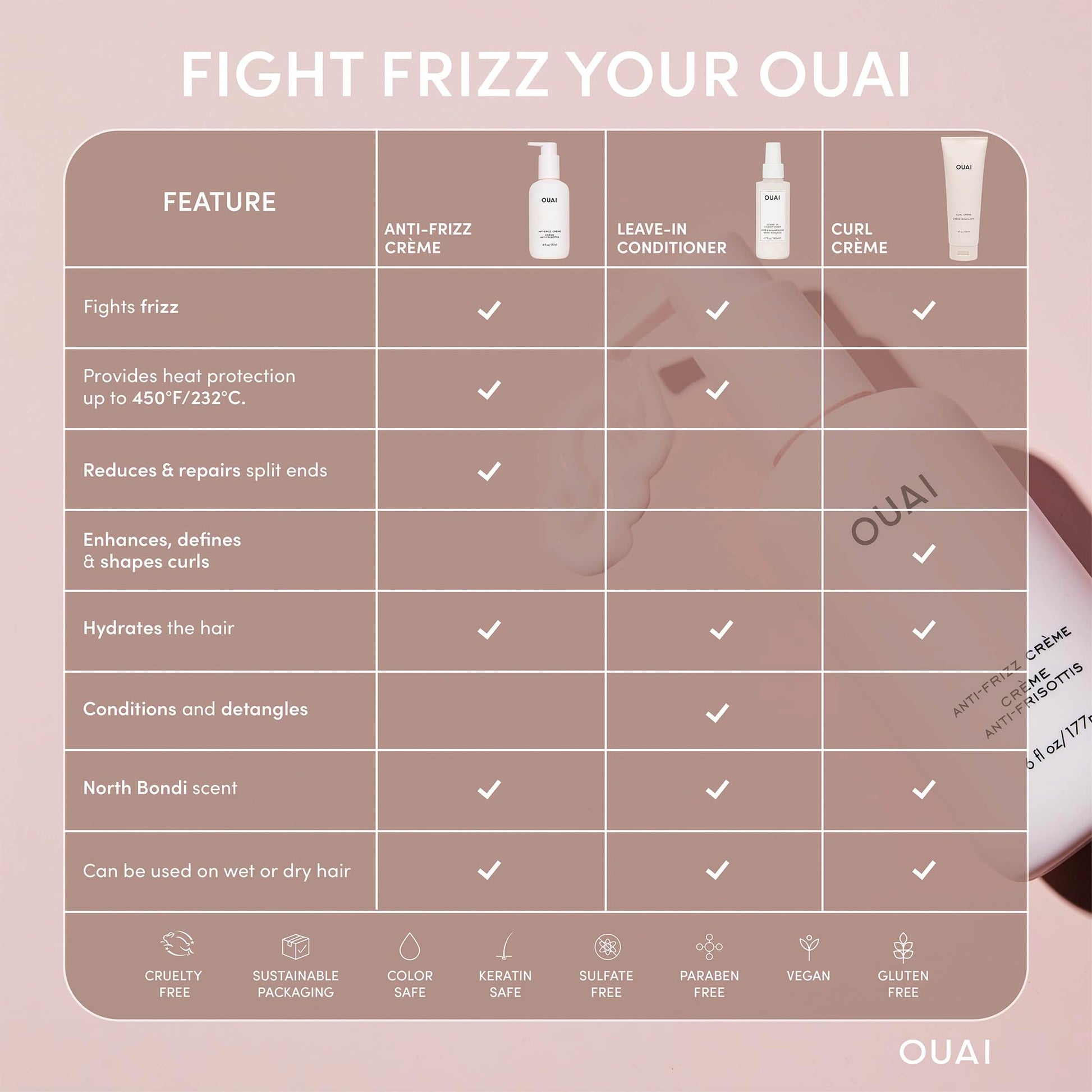 - Too Busy To Be Frizzy - Your hair has better things to do than be frizzy. Anti Frizz Crème is here to give you immediate frizz control & keep it a-OUAI for up to 72 hours. To top it off, it moisturizes & hydrates hair while helping to reduce & repair split ends. Get ready to frizz-free up your schedule.