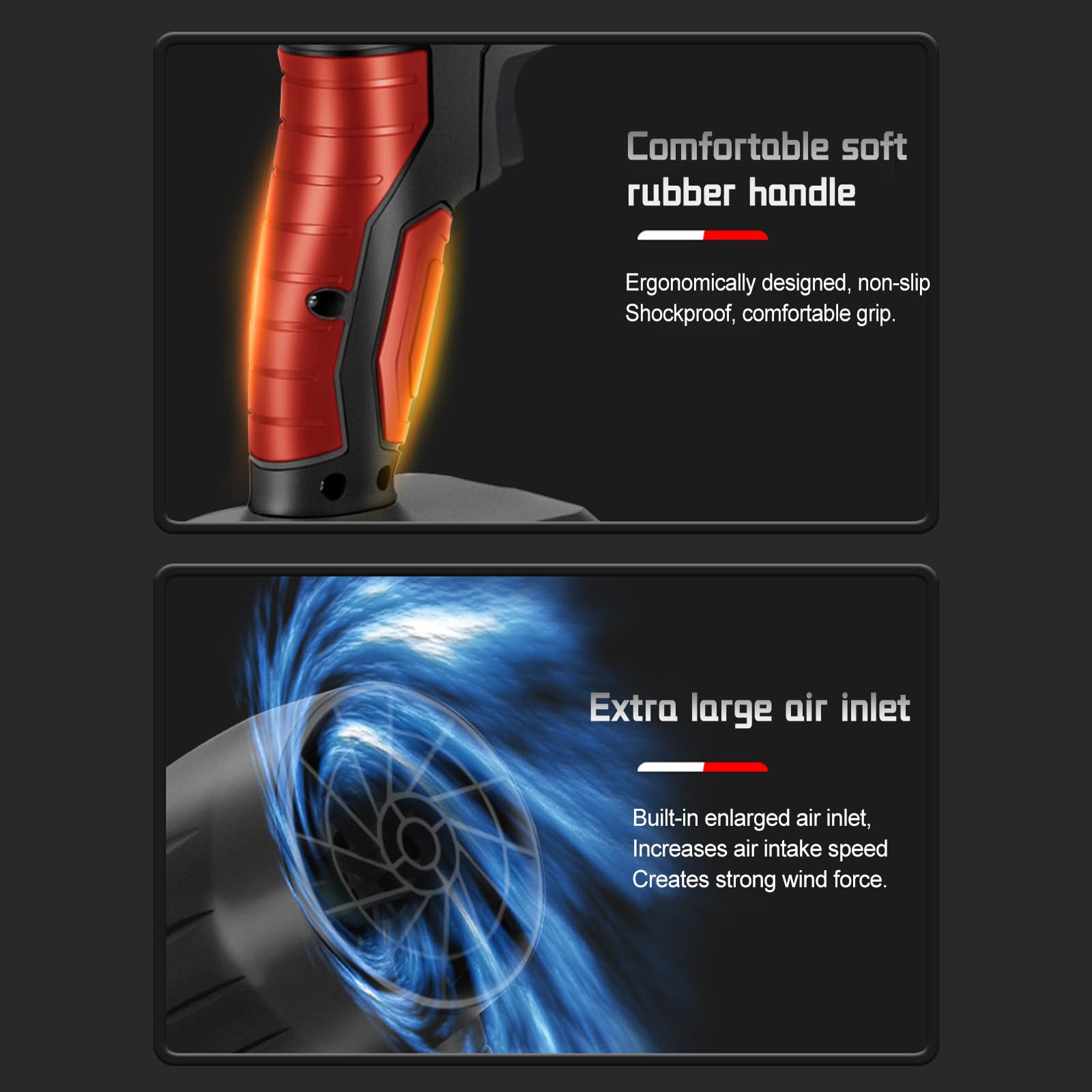 - 【ADVANCED STRUCTURAL DESIGN】: This compressed air duster adopts 80mm large diameter air inlet, 70mm vortex duct design, aerodynamic structural design, high compression ratio, strong wind power; with ergonomic handle design, comfortable to hold, non-slip and drop, corrosion resistance, meet a variety of harsh environments