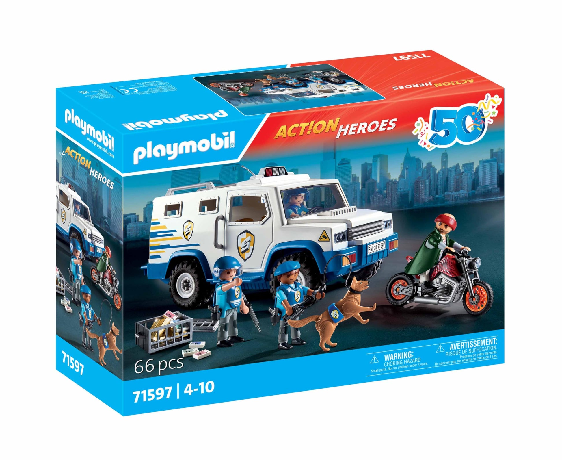 Details: In the heist on the big money transporter, a greedy crook tries to snatch the loot from the transporter and escape on his fast motorbike. In this clever scenario, one of the money transporter's companions can be transformed into a crook by turning his head. The van's roof is removable and the rear doors can be opened.