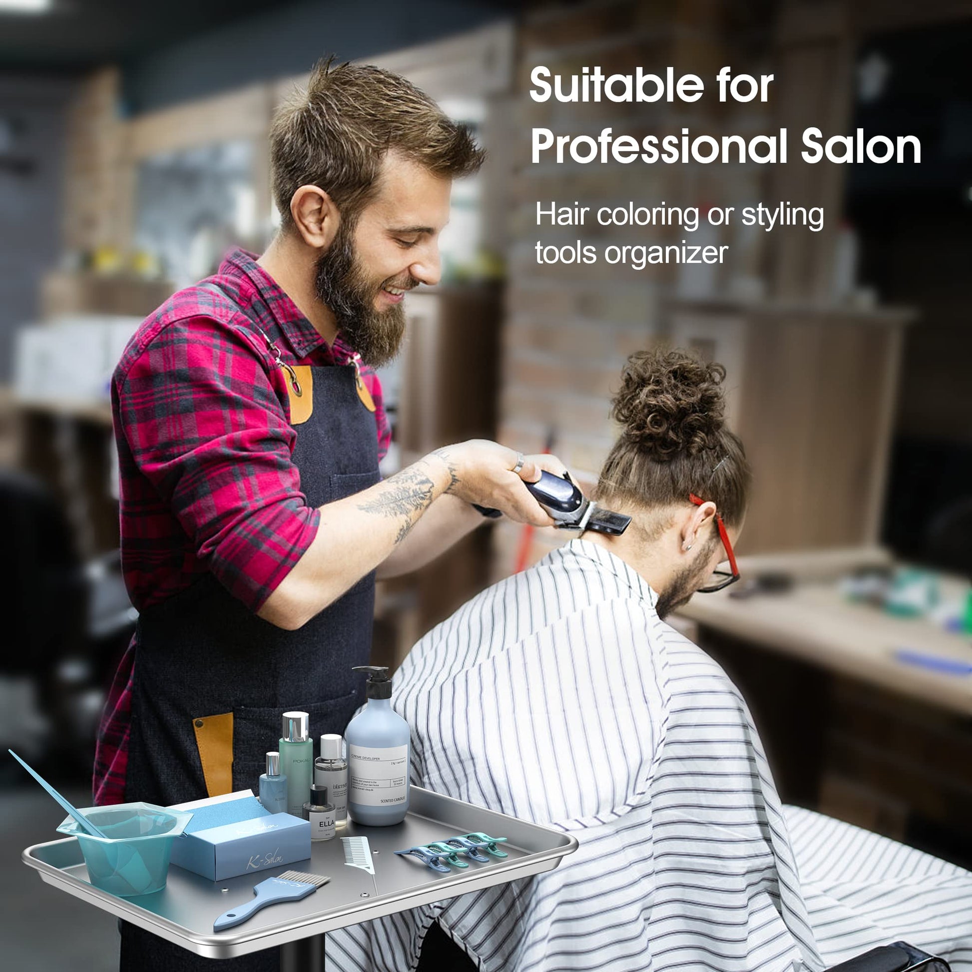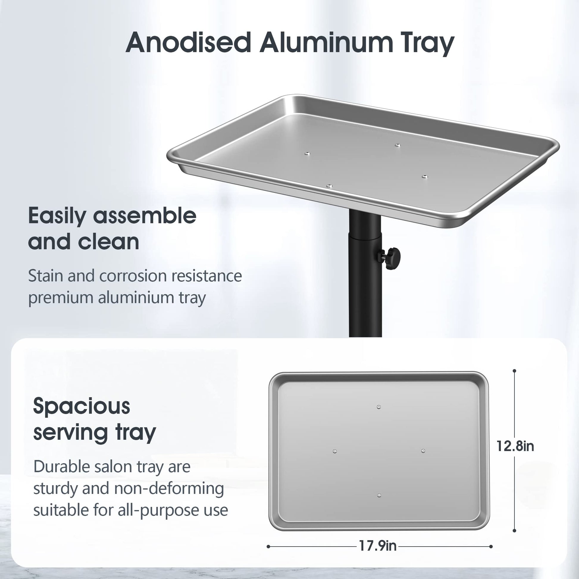 Details: Premium aluminum salon tray provides an uncluttered work area to conveniently accomplish any task. The top tray is large enough to hold hair dye tools and keep beauty liquids. Tension knots on the base for adjustable height which lets you to adapt to any situation.