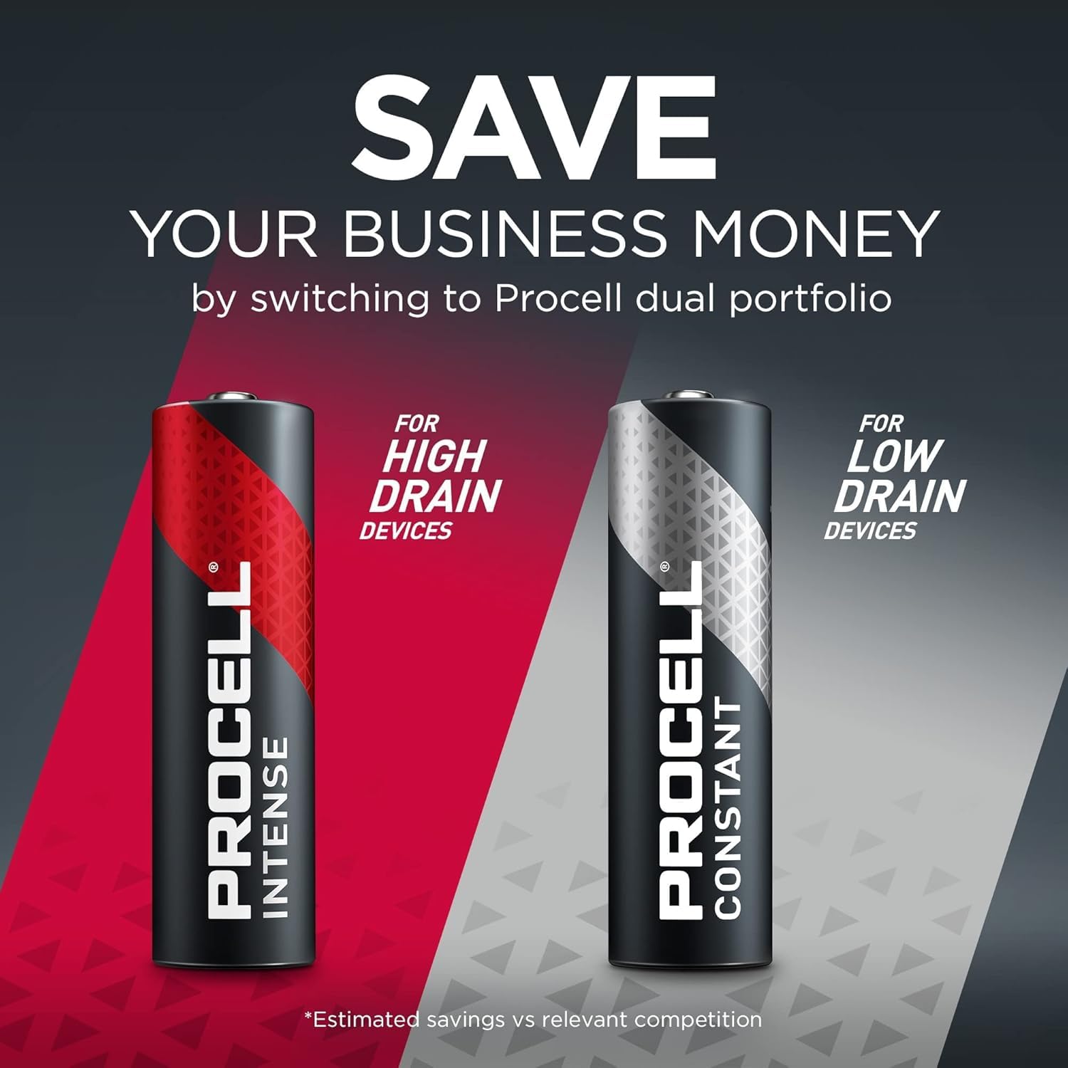 Details: PROCELL Alkaline Intense AA industrial batteries are ideal for powering high drain professional devices which require a high amount of power or peaks of power, such as electronic door locks, soap dispensers, security cameras, safe boxes, blood pressure monitors, automatic faucets, remote security cameras, motorized blinds, and more. Guaranteed 10 years in storage. Delivers longer lasting power (vs. prior PROCELL Alkaline AA batteries) in high drain professional devices that may result in fewer battery replacements and can lead to savings on operating costs associated with battery replacement. Operating temperatures from -4°F to 129.2°F. You can use up to 30% fewer batteries by switching to PROCELL Intense for high drain devices (estimated savings versus relevant competition). Manufactured using superior cell design (vs. prior PROCELL Alkaline AA batteries) to ensure high-quality cell construction. Economically packaged. Available in AA, AAA, 9V, C, and D sizes.