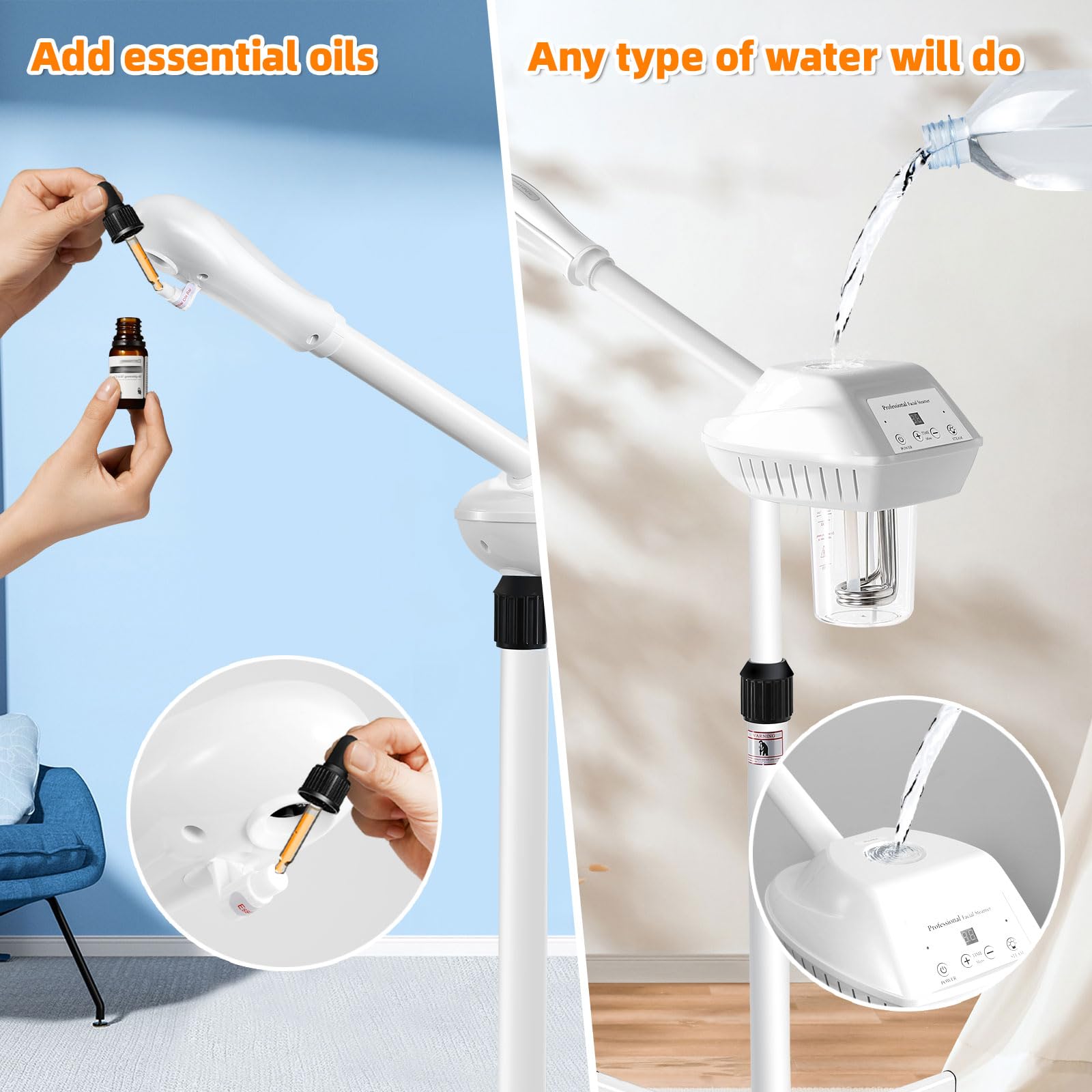 - 【Facial Steamer Adjustable】This facial steamer for face is adjustable from 36 to 52 inches in height, with a 360 degree rotated nozzle and a 360° rotated main body, perfect for different needs of salon and SPA