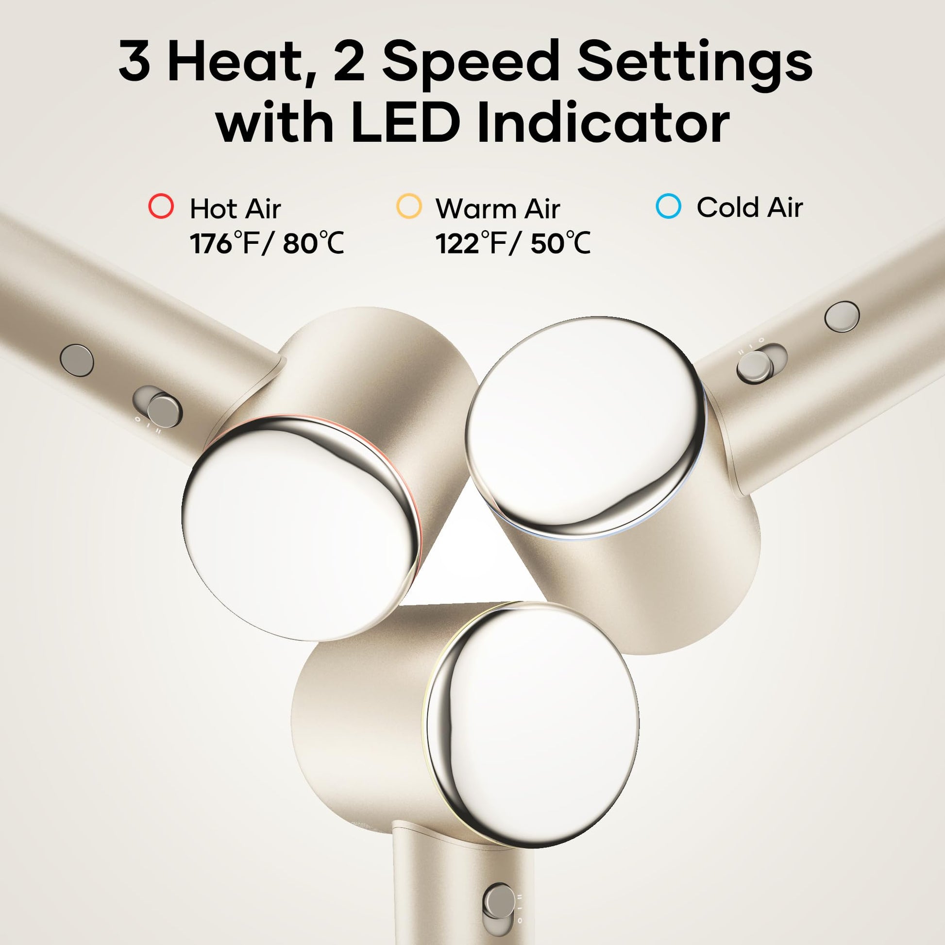 - CUSTOMIZABLE TEMPERATURES & SPEEDS: Our compact hair dryer provide hot and cold air options with 4 temperature settings:high, medium,low and air circulation. Accordingly, each temperature mode is indicated by a ring light with different color and each mode also offers 2 wind speed options: gentle and fast. Choose the perfect mode to suit your hair and meet your drying or styling needs.