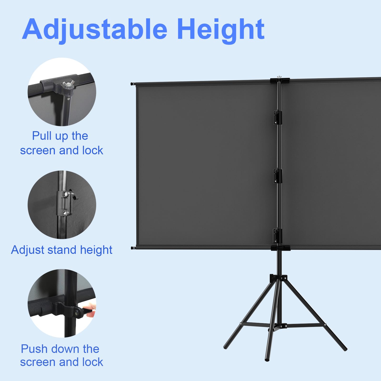 - Easy to set up:This screen only takes 5 minutes to set up.It is also easily adjustable in height;160 wide viewing angle support many people to watch movie or live sports games at the same time without feeling crowded.