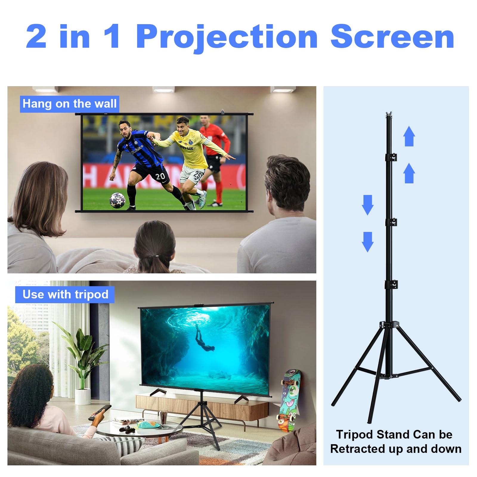 - Projector screen and stand:Single tripod screen is light weight and portable,the tripod stands were made of high quality metal which is very strong and sturdy.a sand bag is included in package for you to add weight when use outdoor.