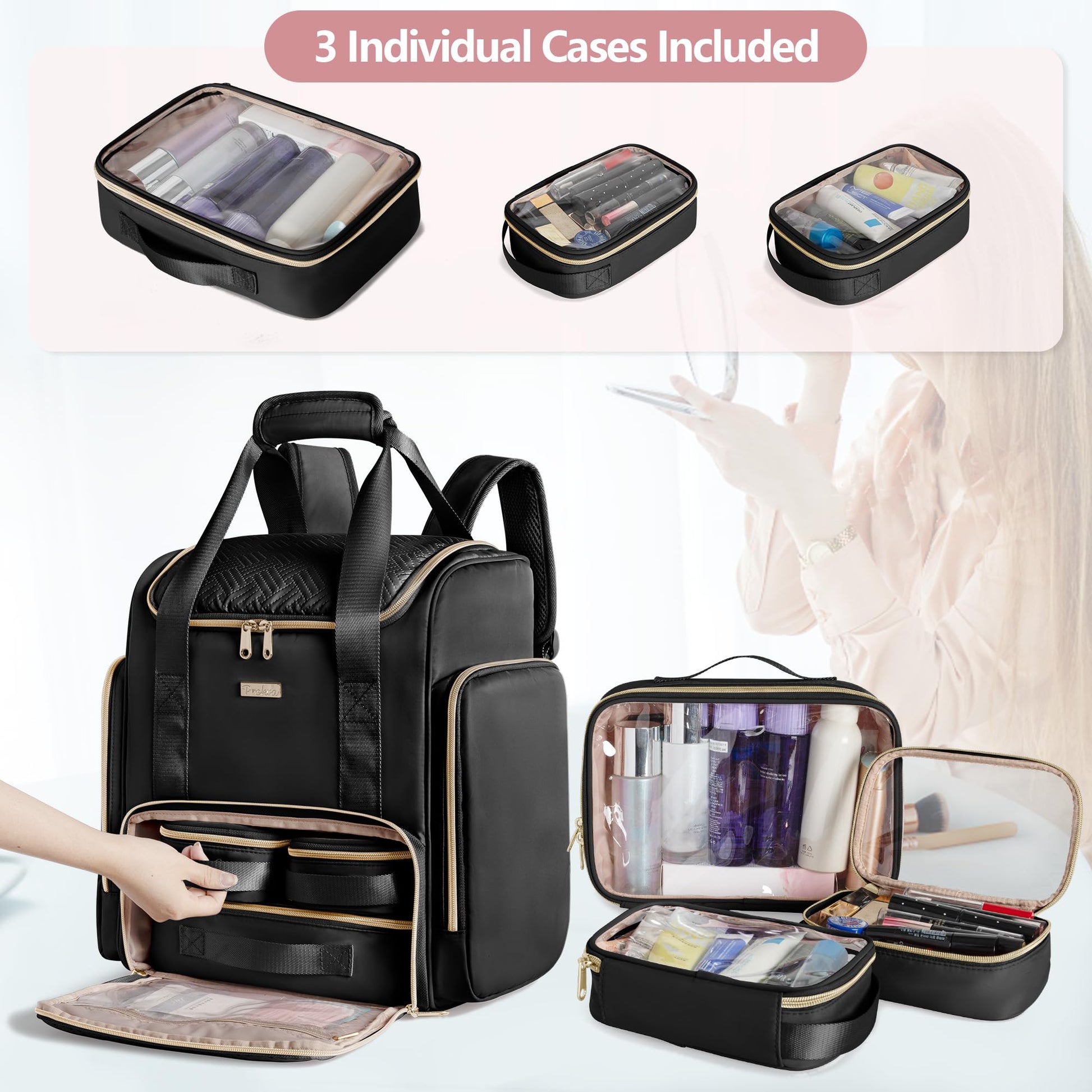 Prokva Large Makeup Backpack with 3 Clear Makeup Bags, Double Layers Professional Makeup Travel Case with Brushes Storage Section for Makeup Artists, Black (Patent Design)