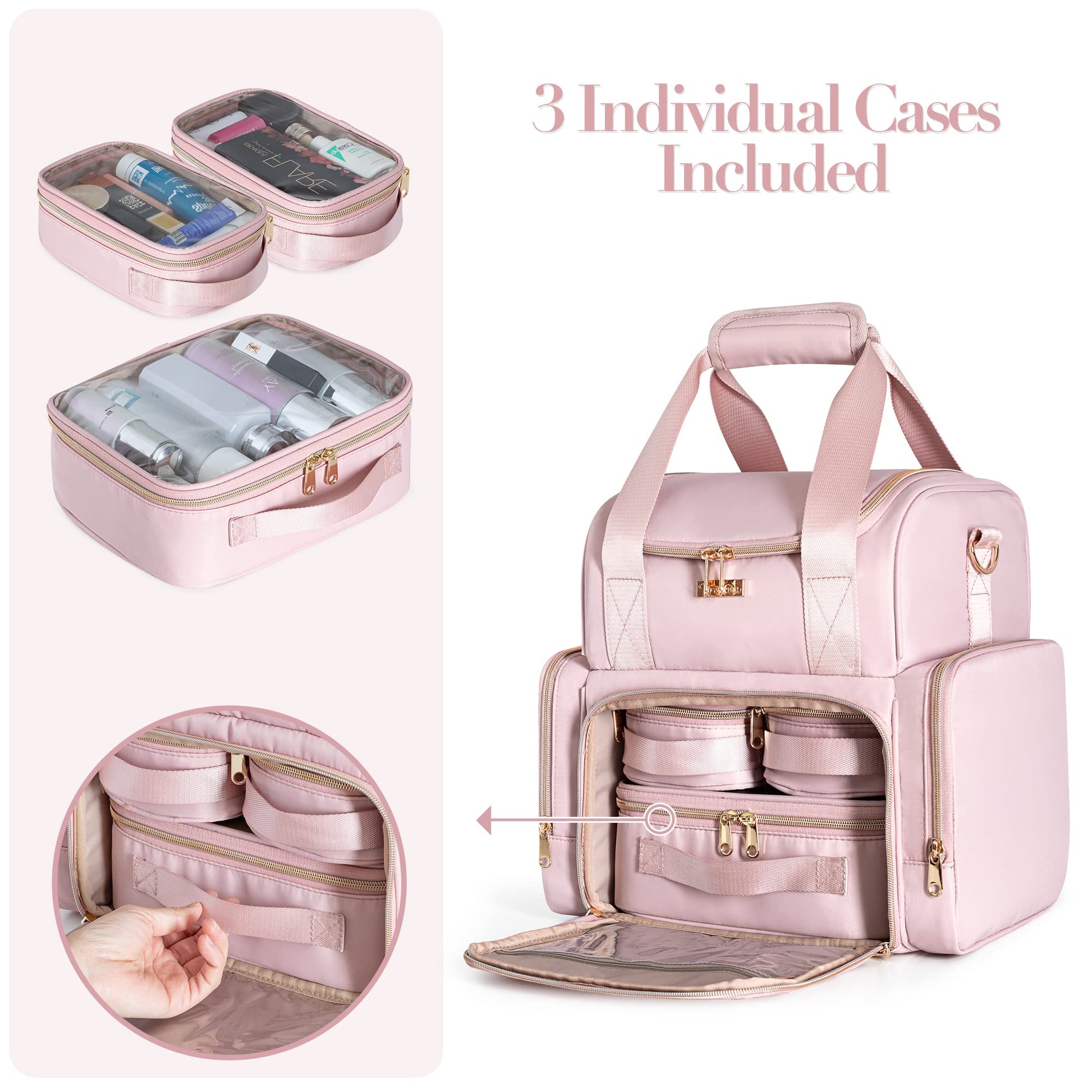 - 【3 INDIVIDUAL CASE】 Bottom compartment contains 1 large case (24x19x8.5cm) and 2 small cases (20x11x6cm) to classify your cosmetic and keep them in order. Each case designed with clear window for easy to find items at a glance and can be used individually. A transparent zipper pocket inside for storing samples or small stuffs.