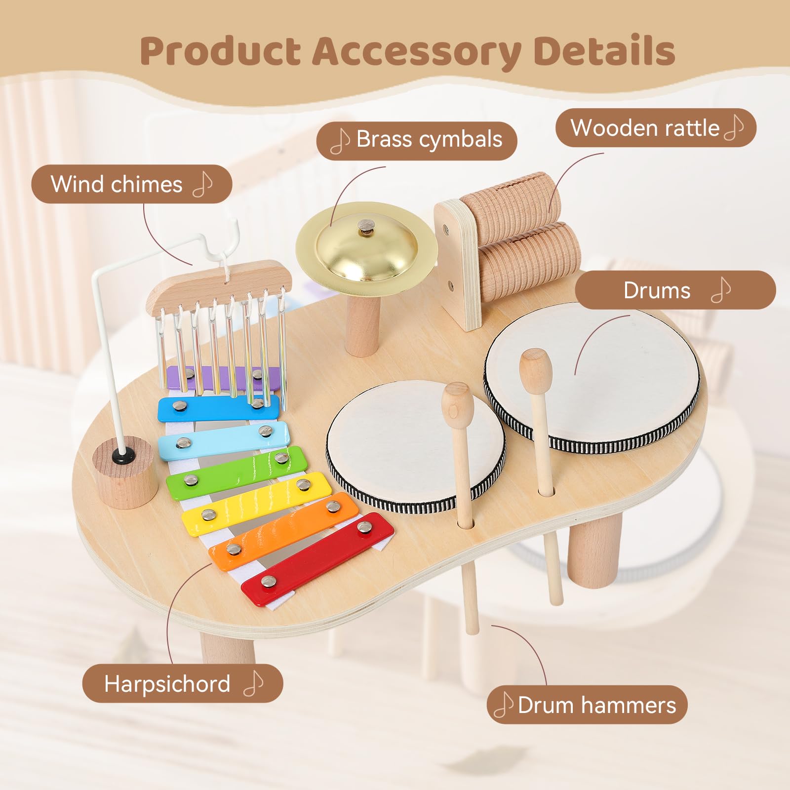 - Multi-Functional Design: The musical instruments for toddlers features various instruments, including xylophone, wind chime, brass cymbals, wooden rattle and 2 drums, all could mounted on a durable wooden platform.
